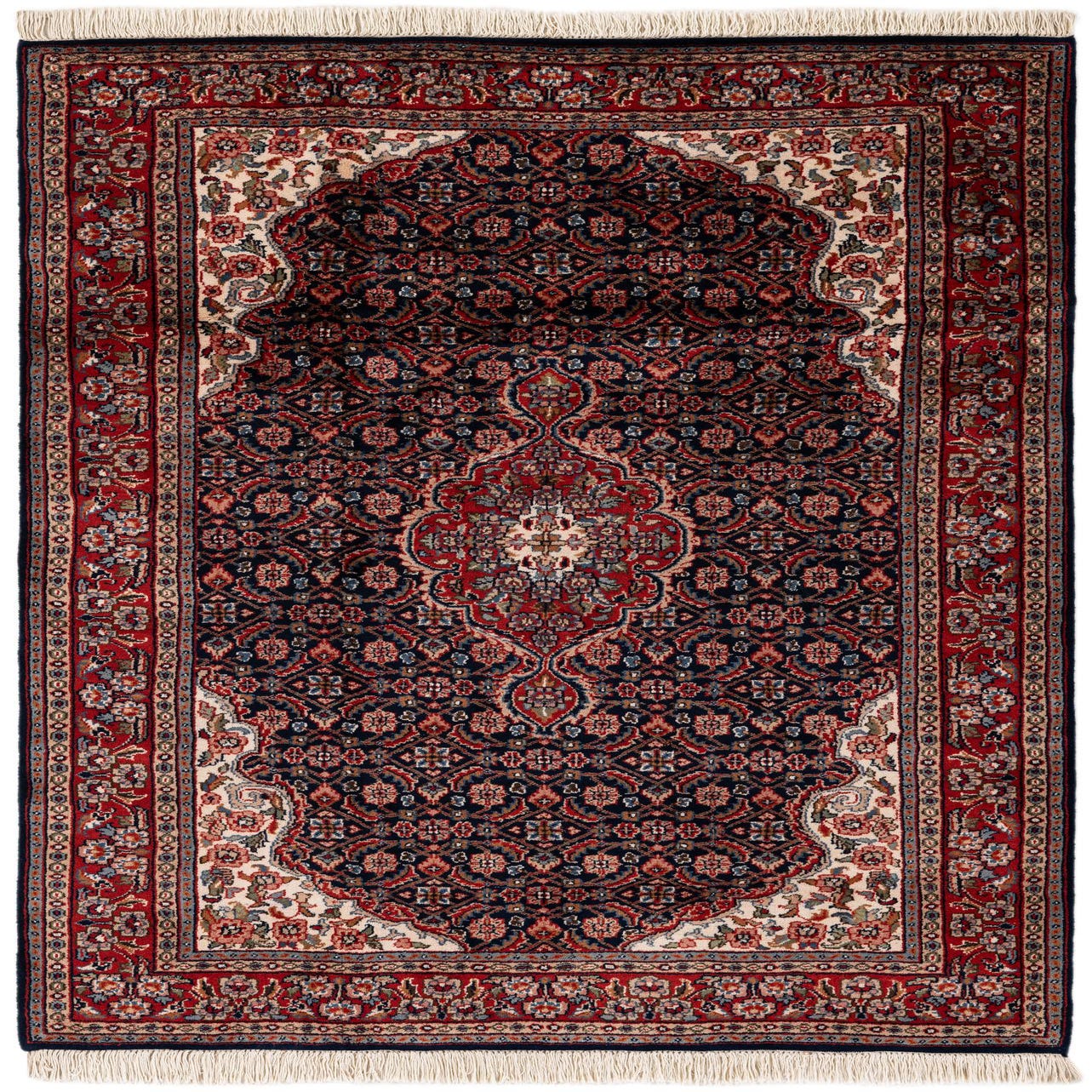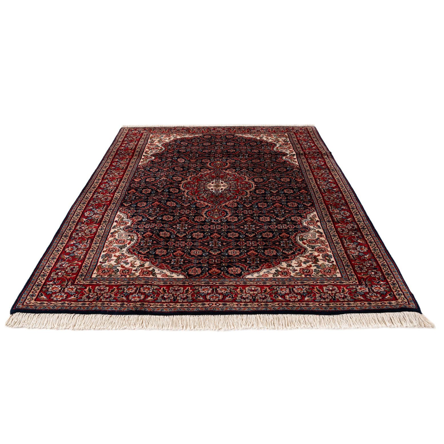 A 4x6 rectangular navy blue traditional Oriental rug with a central medallion and intricate floral patterns, featuring red and cream accents.