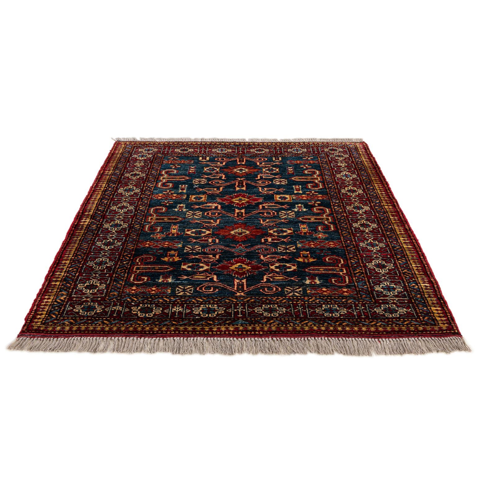 A 4x6 rectangular navy blue wool rug with a detailed Oriental pattern in red, gold, and light blue, featuring a central medallion and intricate border.