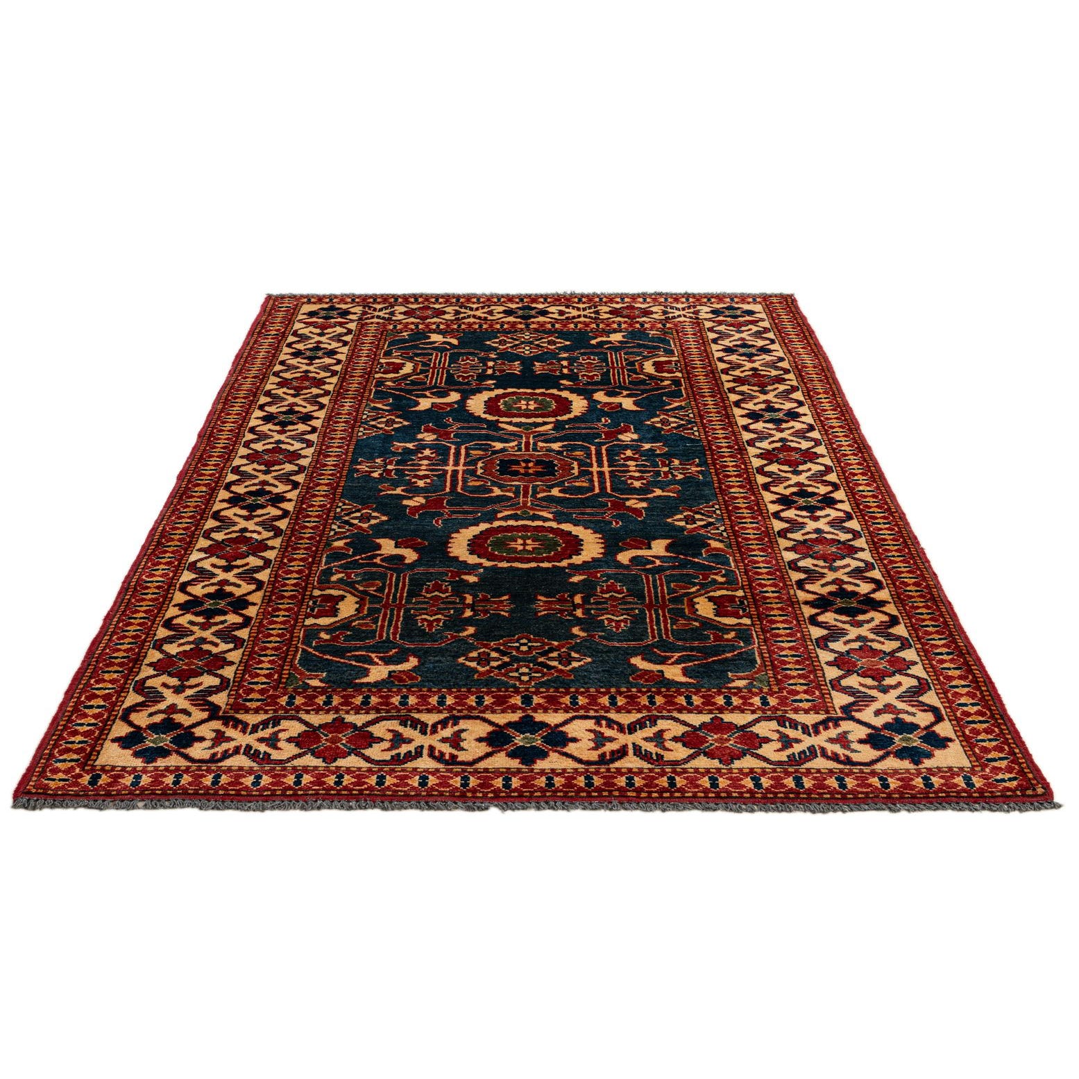 A 4x6 rectangular Kazak rug with a deep blue field and intricate oriental patterns in red, cream, and navy, featuring a detailed border.
