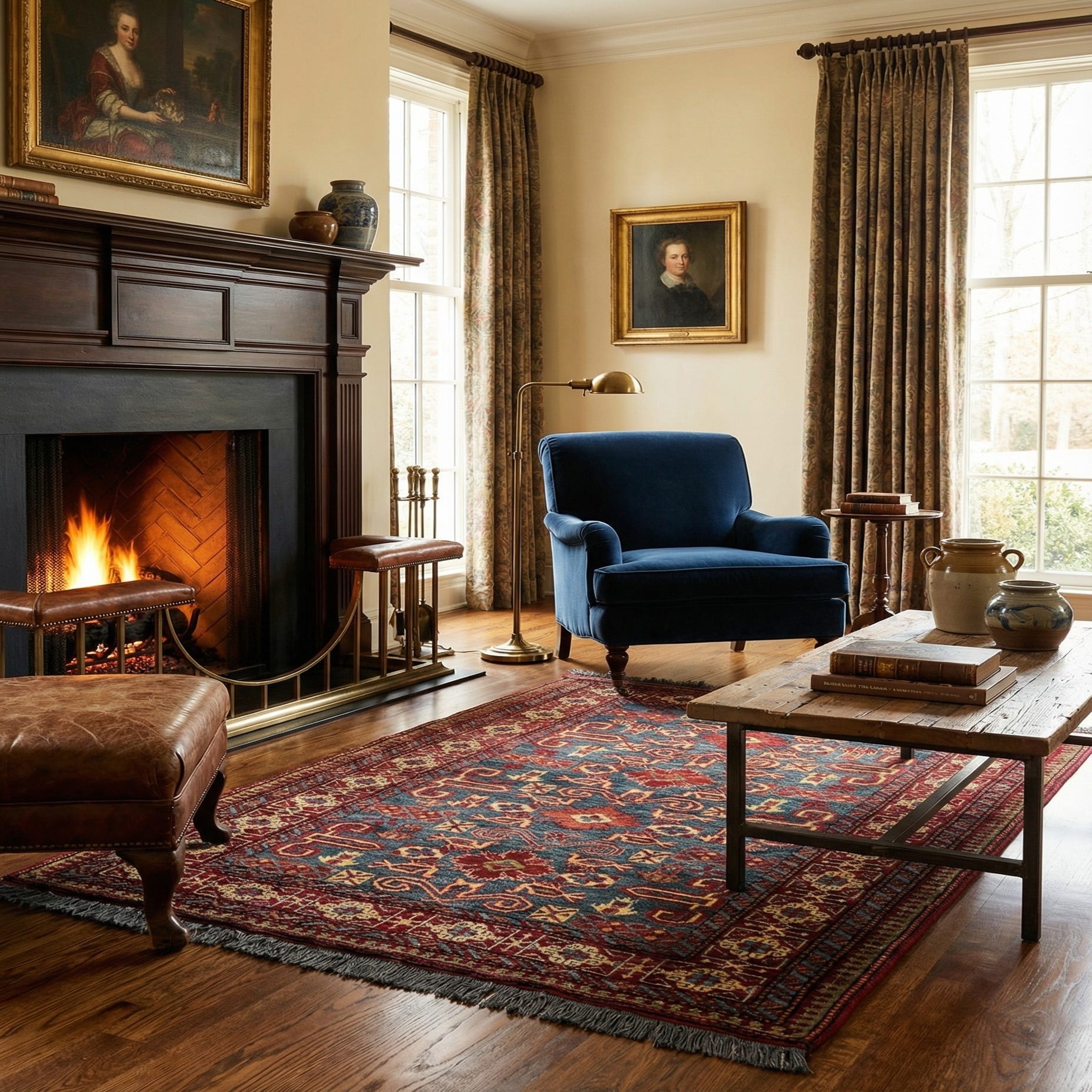 Primary color is Navy Blue. Colors in this rug include: Navy Blue, Beige, Black, Blue, Brown, Red, Orange.
