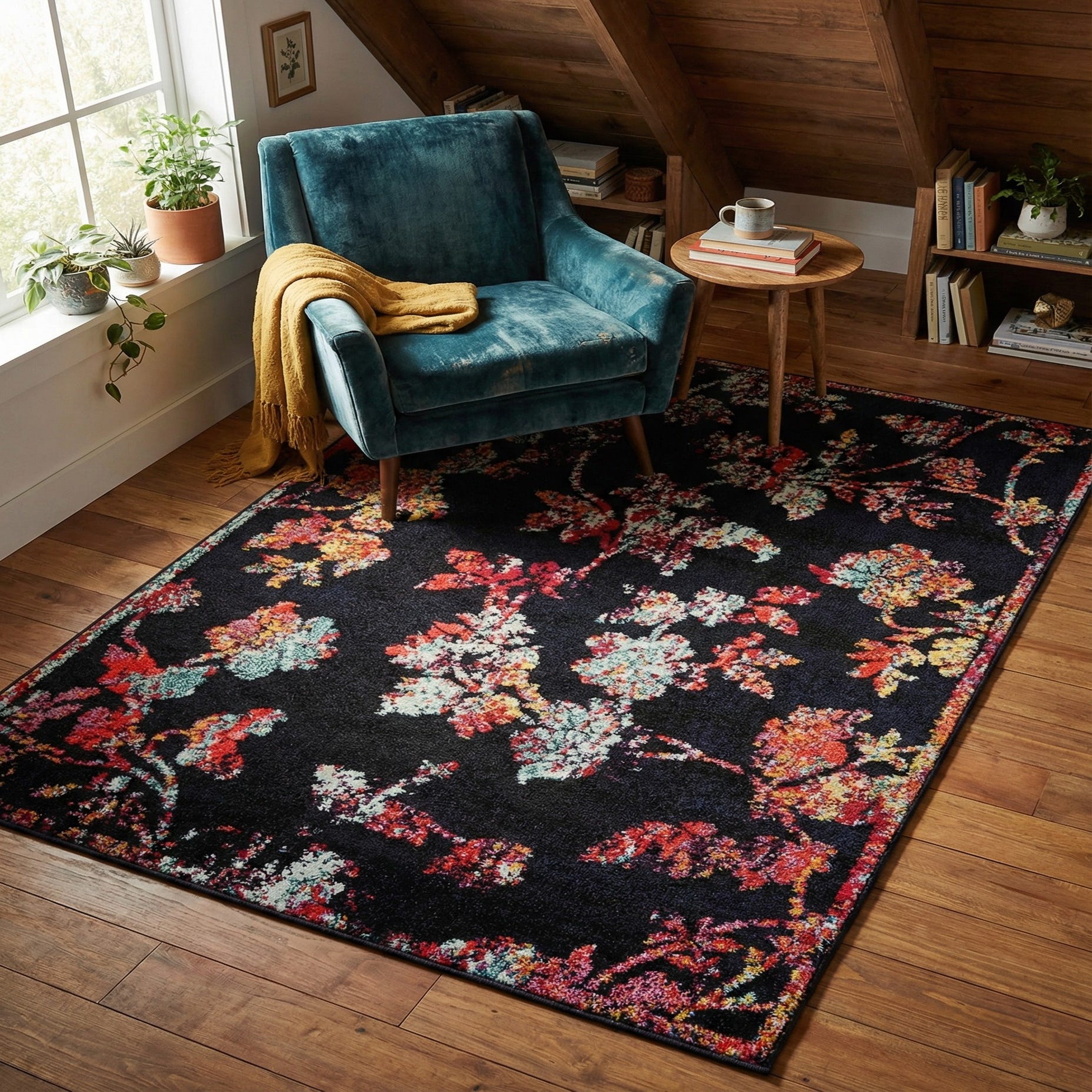 Primary color is Navy Blue. Colors in this rug include: Navy Blue, Blue, Ivory, Light Blue, Orange, Purple, Red, Yellow.