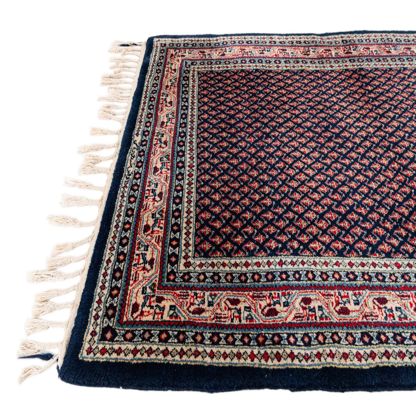 A 4x6 rectangular Rugs.com Mir rug with a navy blue field and intricate red, blue, and cream traditional Oriental pattern, featuring a detailed border and fringe.
