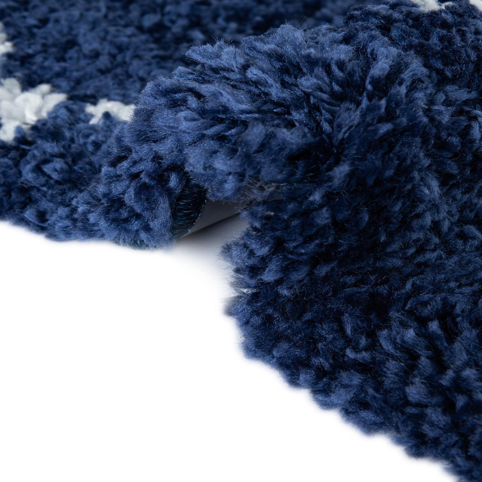 Deep navy forms the backdrop for a lively ivory diamond trellis that carries a slightly irregular, hand-drawn character. The pattern is bold yet simple, with the ivory lines offering crisp contrast against the rich navy ground. A dense, shag-style pile built from 100% polypropylene gives the surface a plush, cushiony feel—soft underfoot with a textured, almost looped appearance that invites touch. Machine-made construction keeps the pattern consistent across the rug while preserving the relaxed, slightly nubby look of the trellis lines.