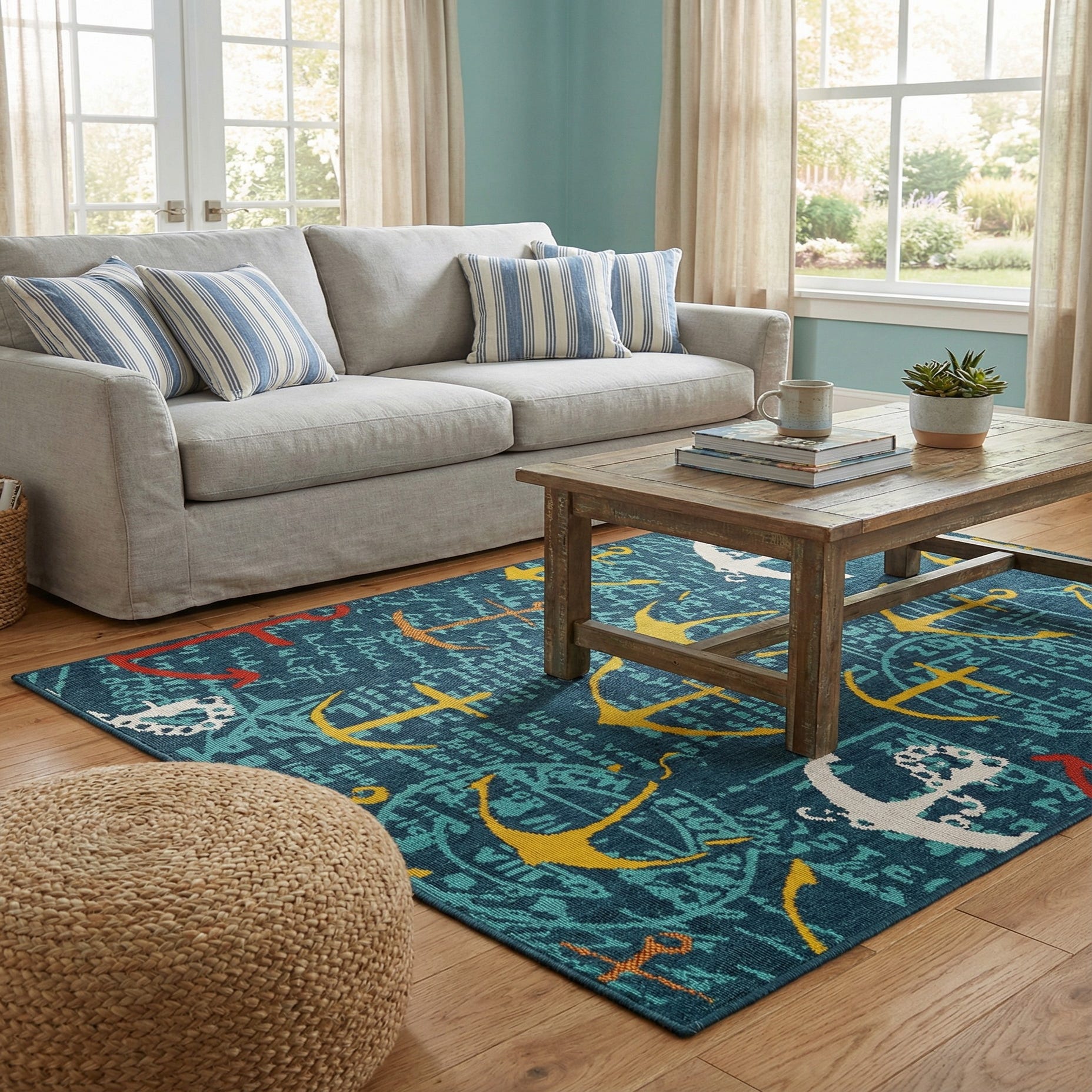 Place this rug on a covered patio or balcony to anchor casual seating, or layer it in a sunroom or entry to introduce a nautical touch. It pairs naturally with weathered wood, white slipcovered seating, wicker accents and teal or coral pillows, and also works well in a beach cottage, poolside lounge or a kid’s nautical-themed play area.