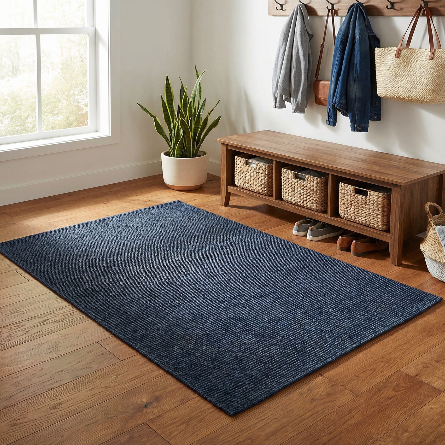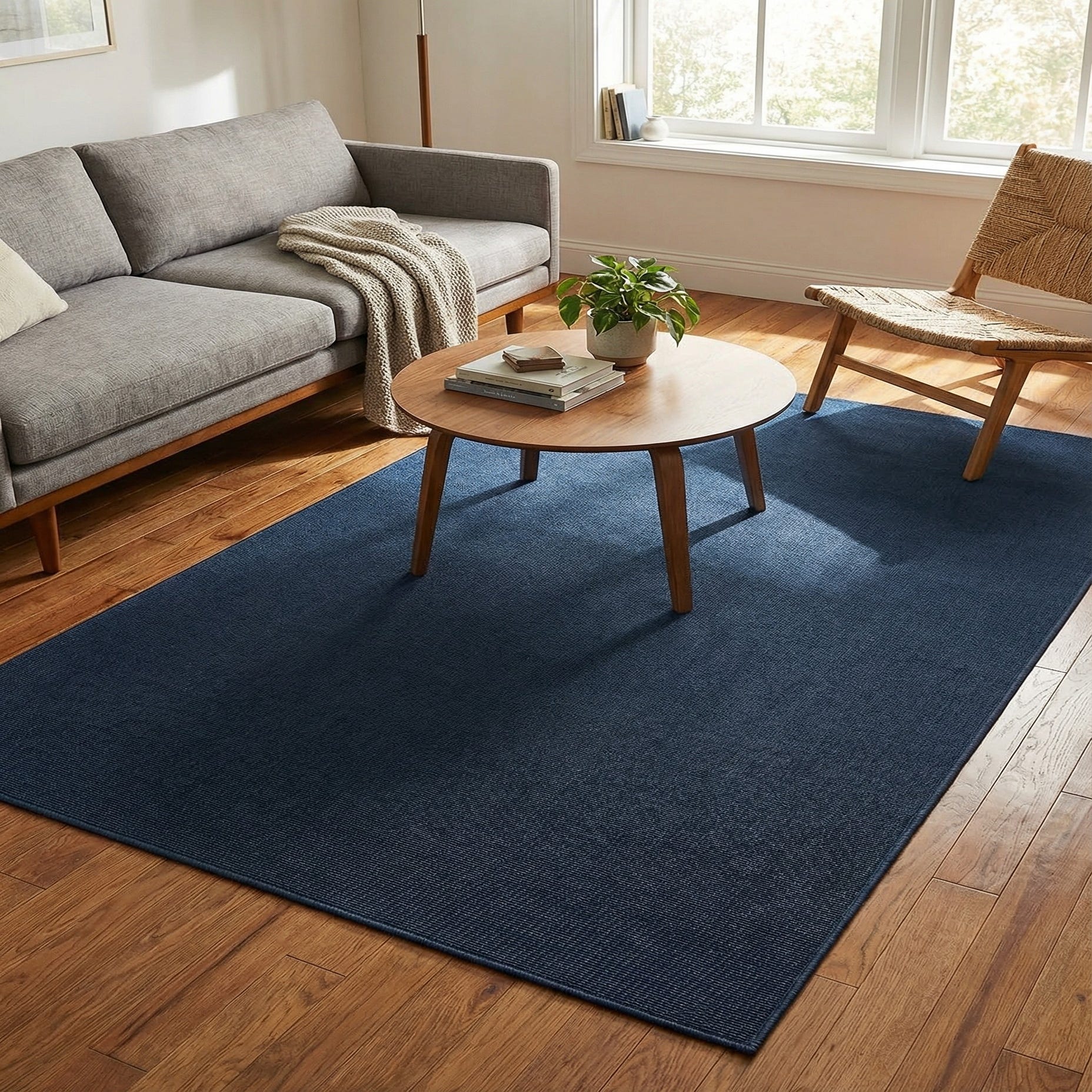 A 4x6 rectangular navy blue modern solid rug, made from polypropylene, suitable for indoor or outdoor use.