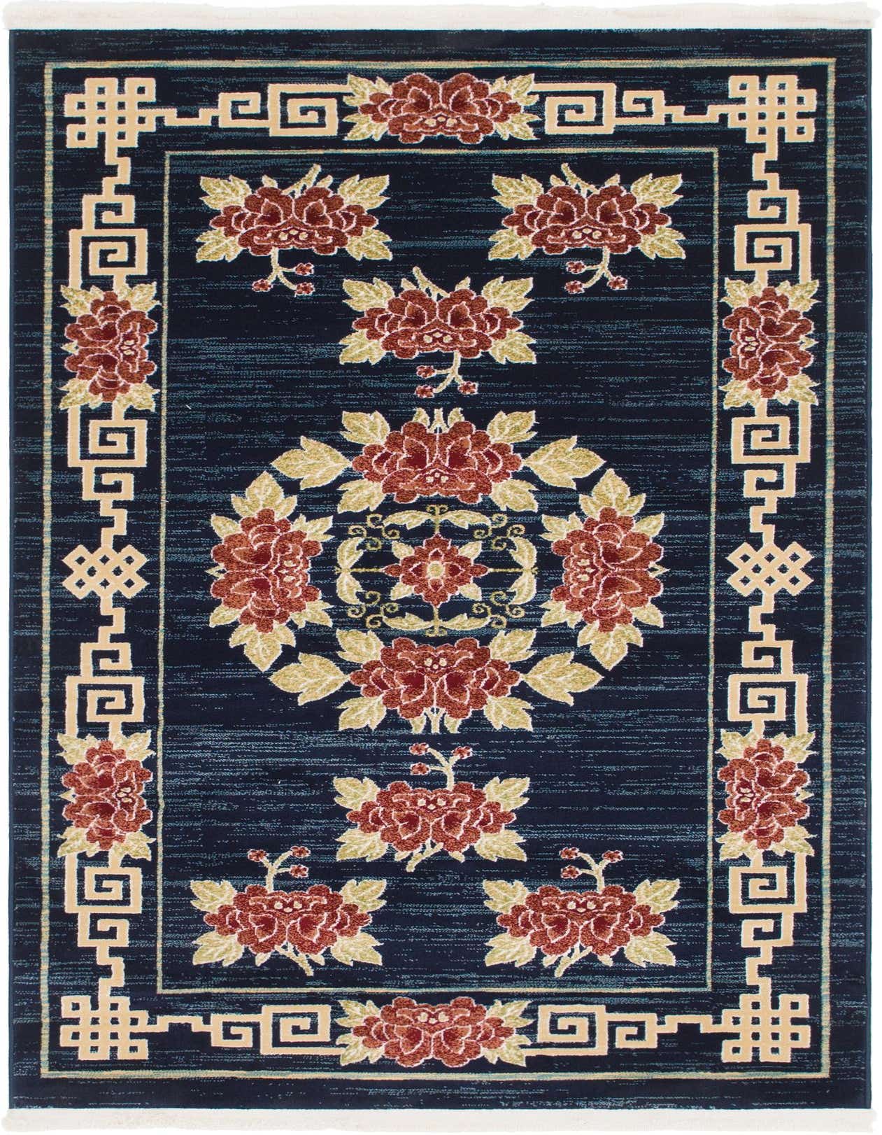 Primary color is Navy Blue. Colors in this rug include: Navy Blue, Burgundy, Cream, Peach, Olive, Blue.