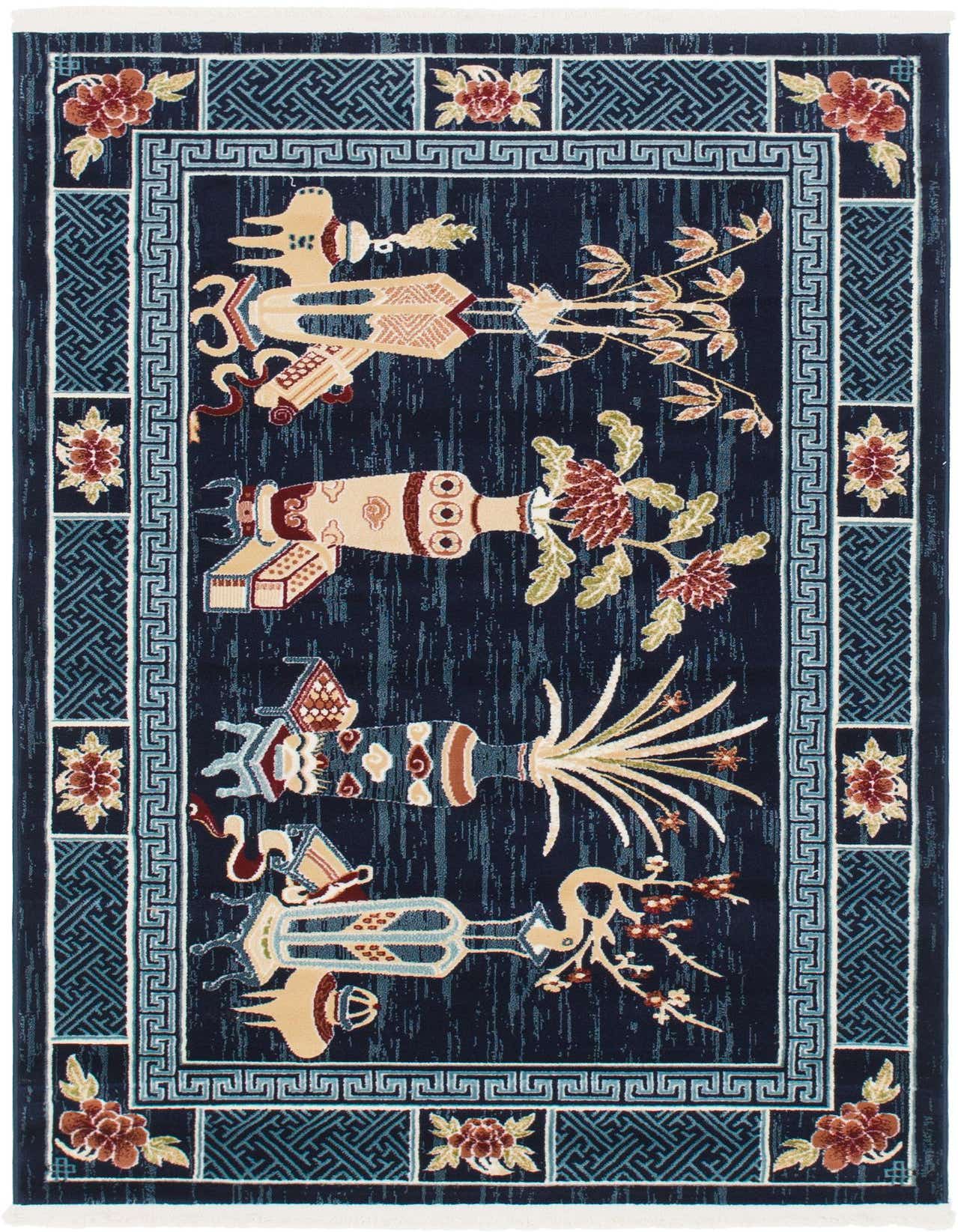 Primary color is Navy Blue. Colors in this rug include: Navy Blue, Blue, Burgundy, Green, Olive, Peach, Tan.