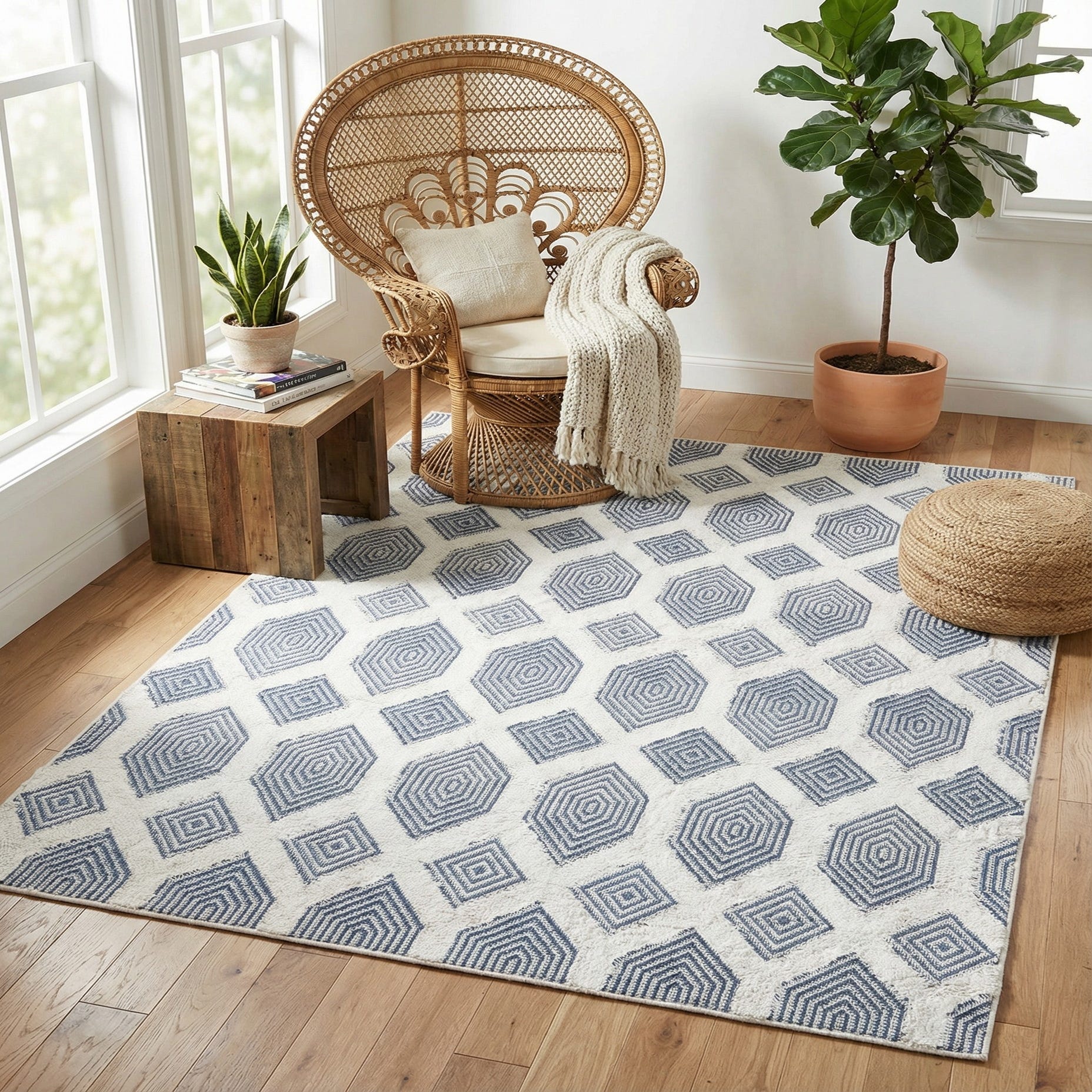 This rug pairs easily with coastal, contemporary, or transitional interiors. Use it to anchor a seating area with a low-profile sofa and light wood coffee table, layer it under the foot of a bed to introduce pattern without overwhelming the room, or place it in a breakfast nook alongside woven chairs for a casual, collected feel. Combine with neutral linens, natural textures, and metal finishes—brushed brass or chrome—to highlight the navy and ivory palette.