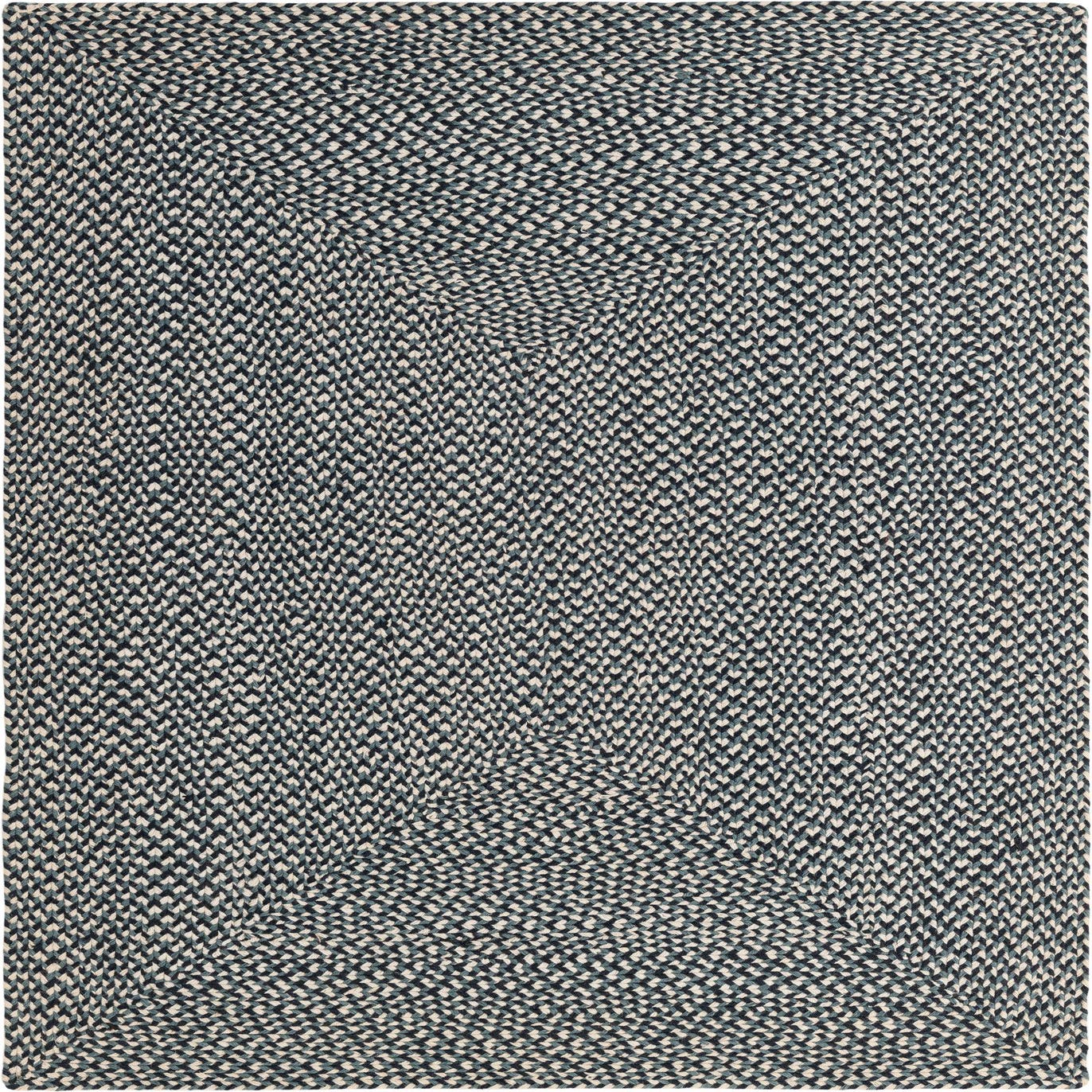 A tightly braided tweed pattern gives this rug a rich, textural presence with a navy blue background woven together with gray and ivory strands. The hand-braided construction in 100% jute creates a subtle, small-scale chevron-like weave that forms a soft rectangular border from the center out, adding visual structure without heaviness. The surface is low-profile and tactile—firm underfoot with the natural, slightly coarse feel characteristic of jute fibers.