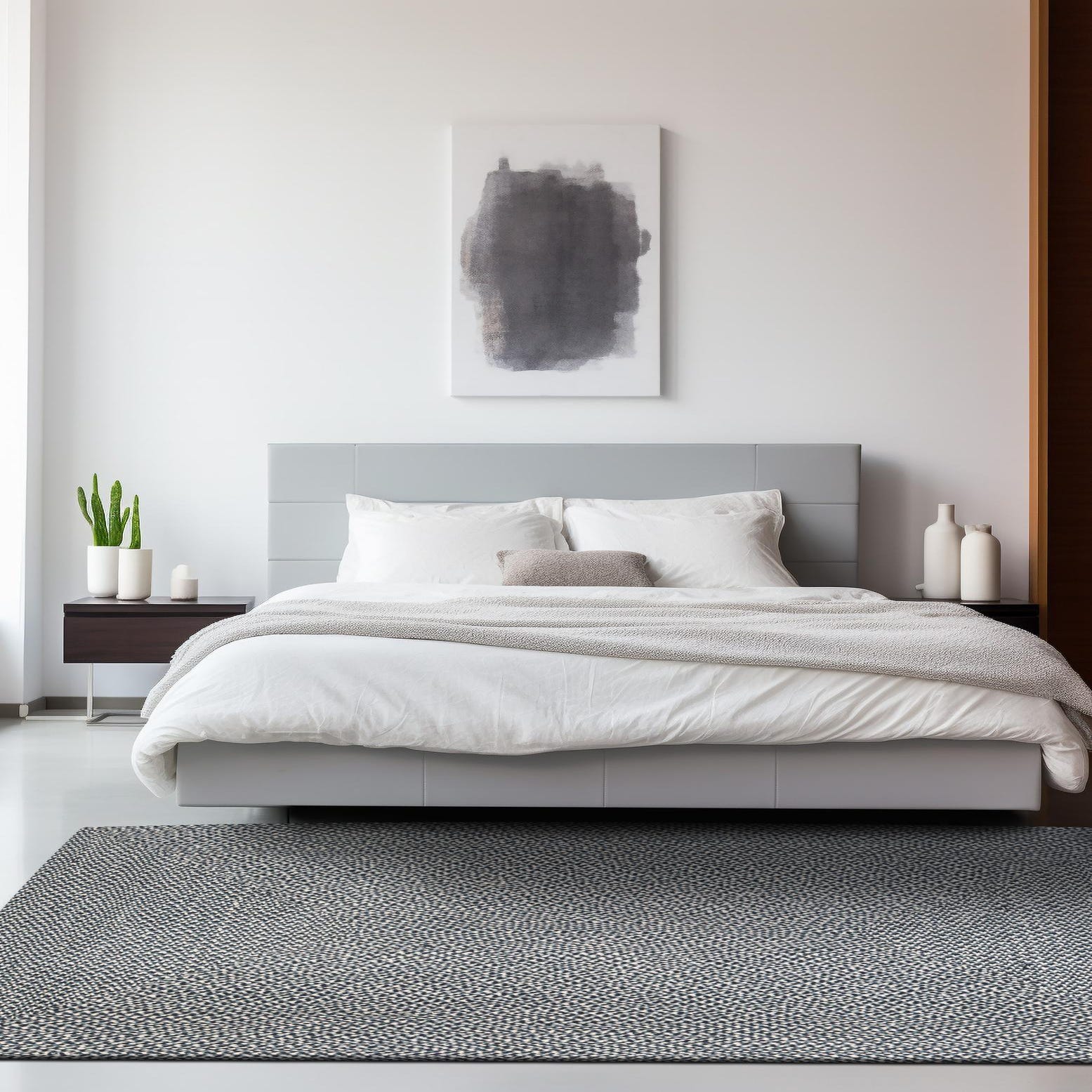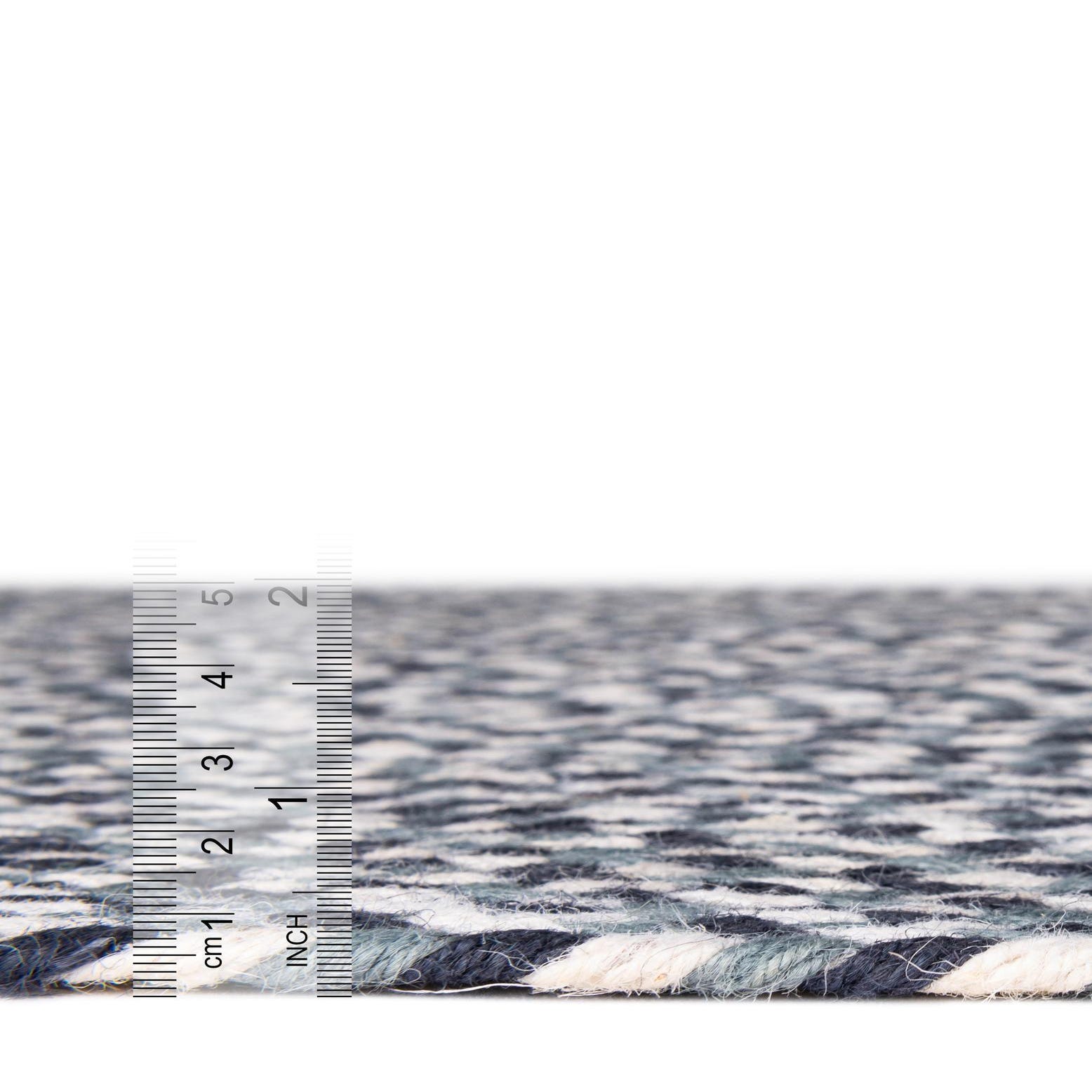 This rug fits well in casual and transitional interiors: place it in an entry or kitchen to ground high-traffic spaces, layer it under a coffee table in a coastal or farmhouse living room, or use it to add texture to a modern cottage bedroom. It pairs naturally with linen upholstery, woven baskets, warm wood tones, and navy or ivory accents for a pulled-together, relaxed look.