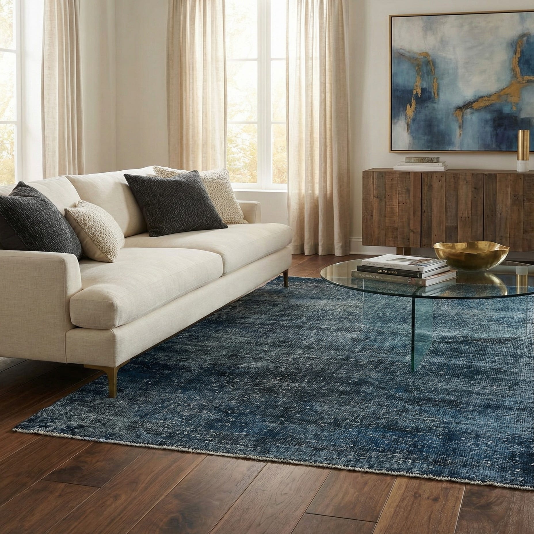 Ideal for contemporary, transitional, or industrial spaces, this rug can anchor a streamlined sofa group, add depth layered under a bed, or define a cozy reading nook or home office seating area. Pair it with warm wood tones and brass accents for contrast, or use crisp ivory textiles and black metal details for a refined, monochromatic look that emphasizes the navy field.