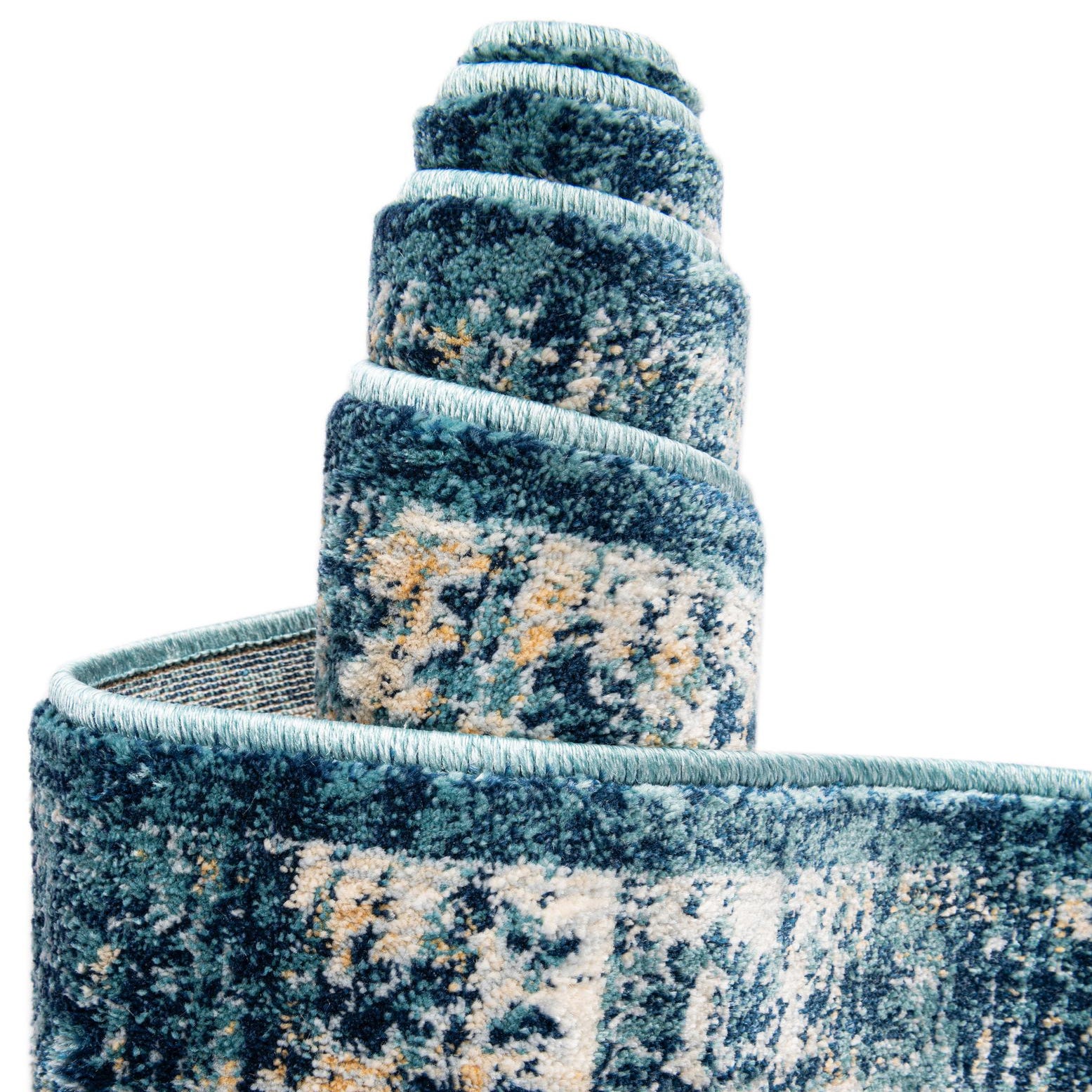 A deep navy blue field provides a strong foundation for a softly distressed, vintage-inspired medallion that blends floral scrolls and geometric borders. Layers of beige, lighter blues, gray and tan create visual depth and a subtly worn effect across the surface. Machine-made from 100% polypropylene, the rug has a low, dense pile with a smooth hand that feels soft underfoot while maintaining clear pattern definition and a neat, finished edge. The octagonal shape adds architectural interest and a tailored silhouette.