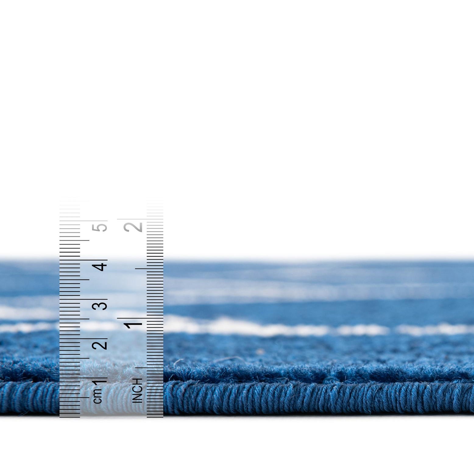 Machine-made of 100% polypropylene, the rug offers a low-to-medium pile with a soft, slightly velvety hand and a subtle sheen that highlights the contrast between the navy background and the crisp ivory pattern. Place it in an entry or foyer for instant visual impact, layer it in a living room beneath a compact seating arrangement, or set it under a small dining or bistro table — it also fits nicely in a home office or reading nook where a tailored, contemporary touch is wanted.