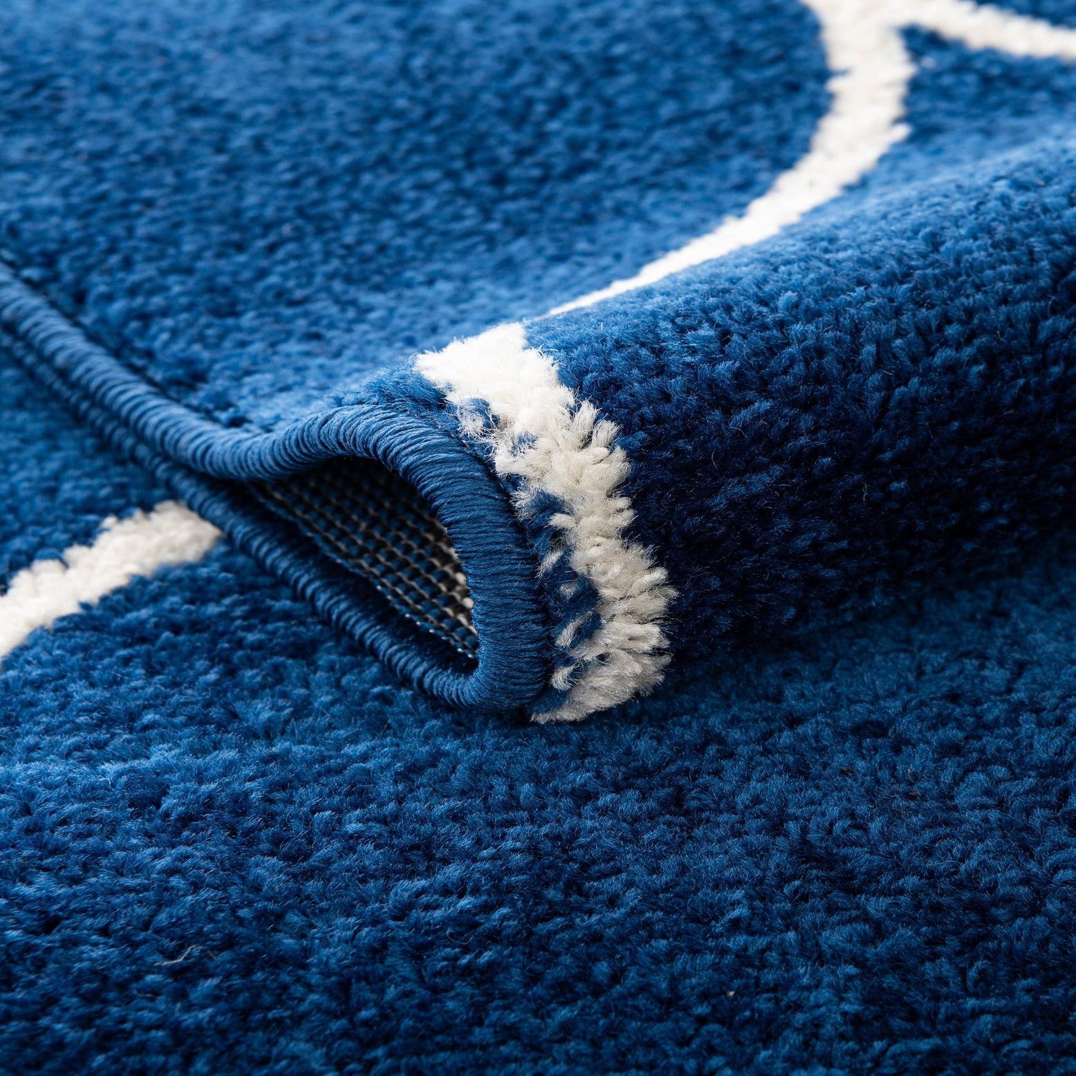 Deep navy blue provides a rich, even field for a repeating ivory lattice motif that brings graphic structure without feeling fussy. The arabesque-inspired trellis pattern uses clean, curving lines to create a rhythmic, modern look, and the octagonal silhouette adds an architectural note that works well as a focal floor piece.