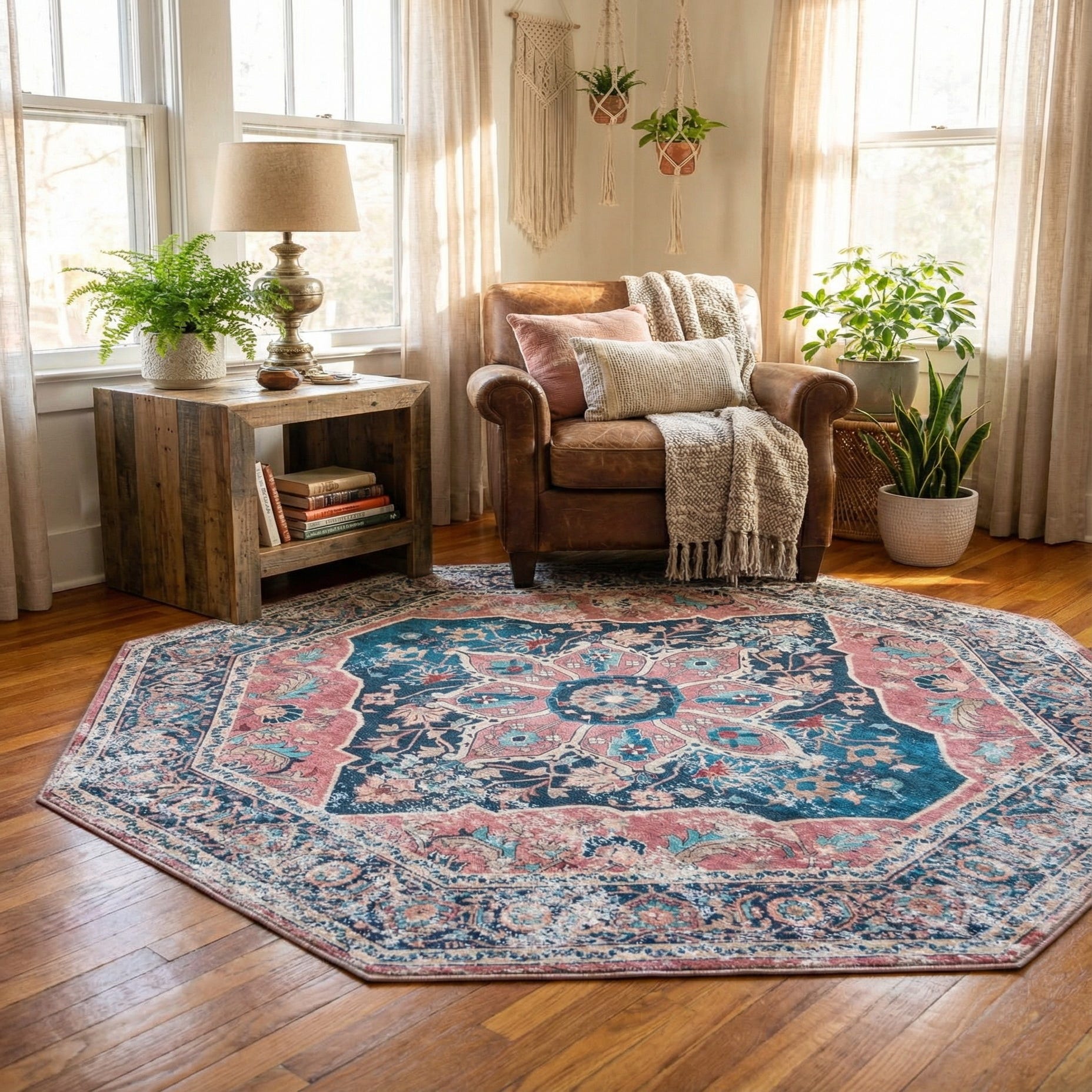 Machine-made from polyester with chenille highlights, the surface pairs plush, velvety chenille accents with a supportive polyester foundation for a low-profile pile that’s pleasant to touch and sits nicely beneath furniture. Place this octagonal rug under a round dining table or in an entryway to create a welcoming focal point; it also works beautifully in a cozy reading corner, a bedroom seating area, or layered in a living room with light-wood furniture and warm metallic accents.