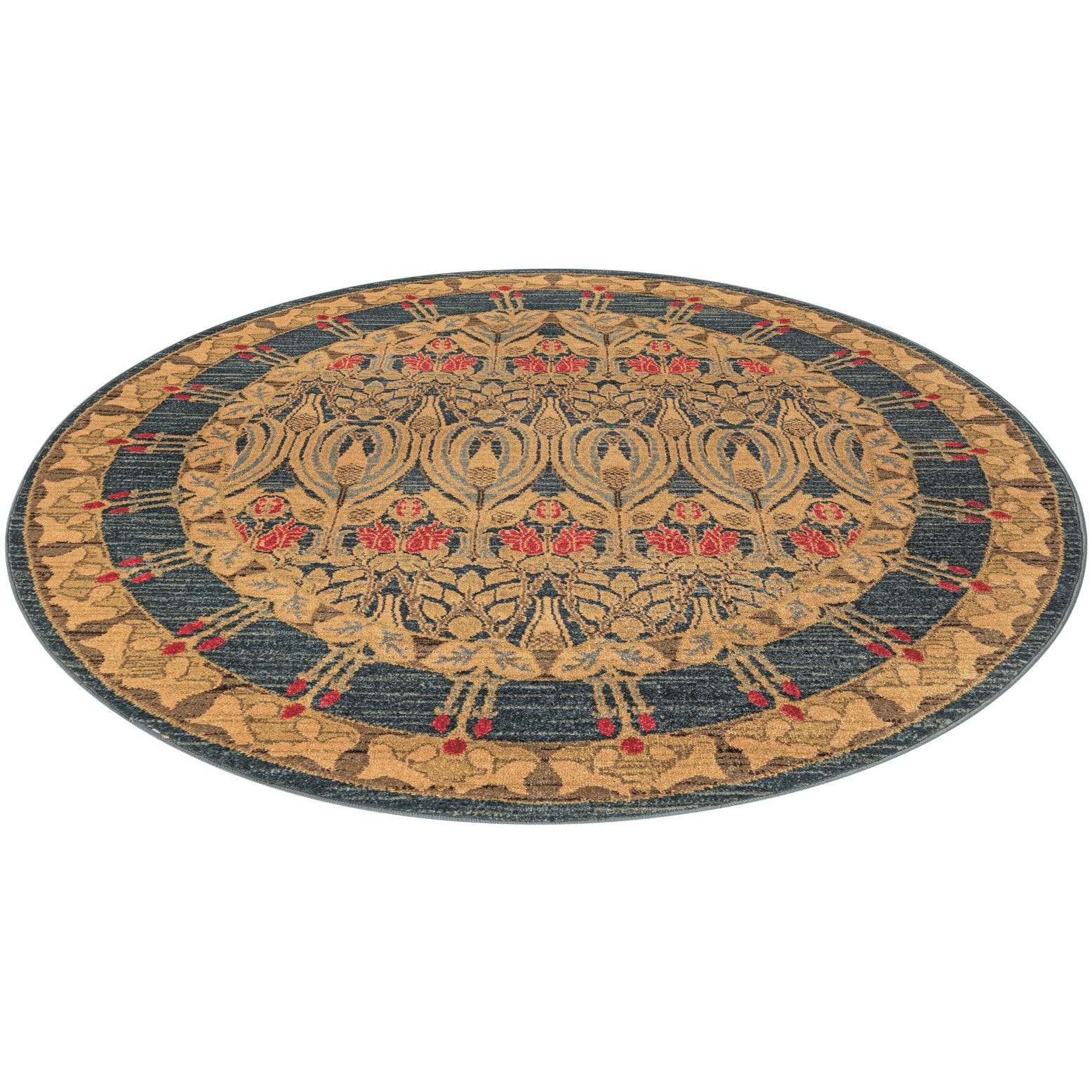 This area rug would complement a variety of decor settings, from traditional spaces that celebrate classic patterns, to transitional interiors where it can serve as a statement piece against more subdued furniture and decor. In a coastal-themed room, the navy blue would resonate with nautical elements, while the warm accent colors could tie in with rustic wooden furnishings or a more eclectic bohemian style. The circular shape makes it an ideal choice for adding structure to open spaces or creating an intimate nook in larger rooms.