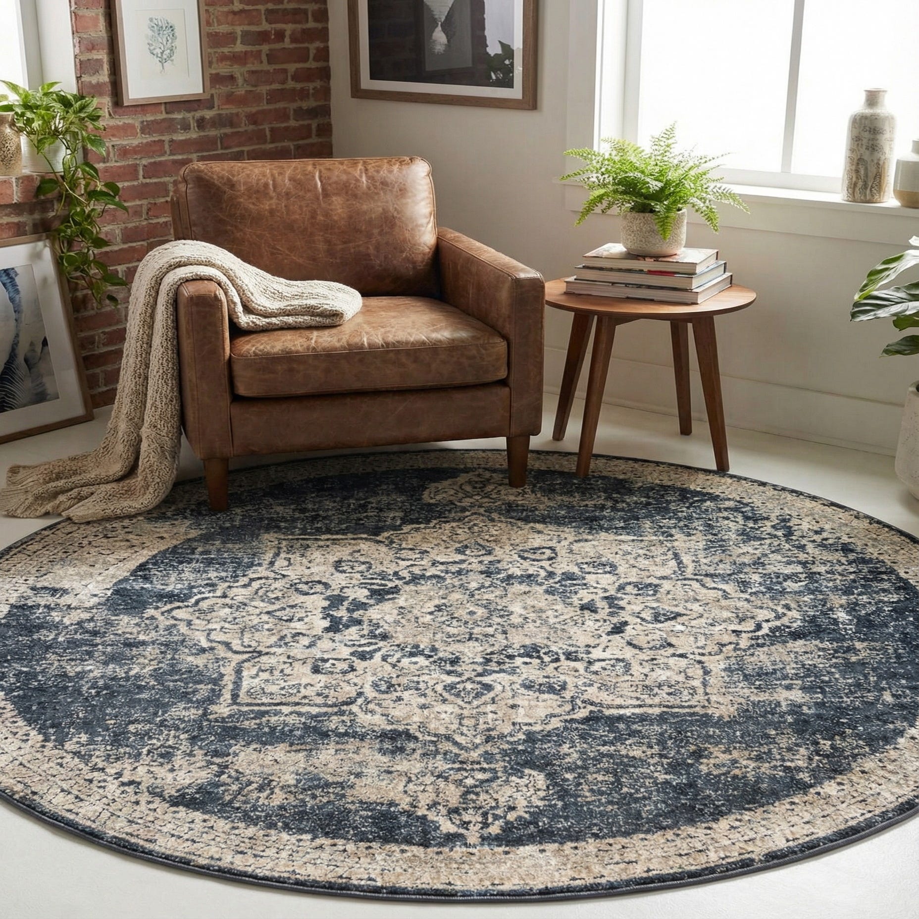 A traditional medallion pattern is softened by a worn, vintage-inspired finish on this round rug. A deep navy background anchors the design while beige and ivory motifs form an ornate center medallion and a subtle patterned border. Machine made of 85% polypropylene and 15% chenille, the rug combines a low-profile, durable base with chenille highlights that add a soft, slightly velvety hand underfoot and gentle textural contrast across the surface.