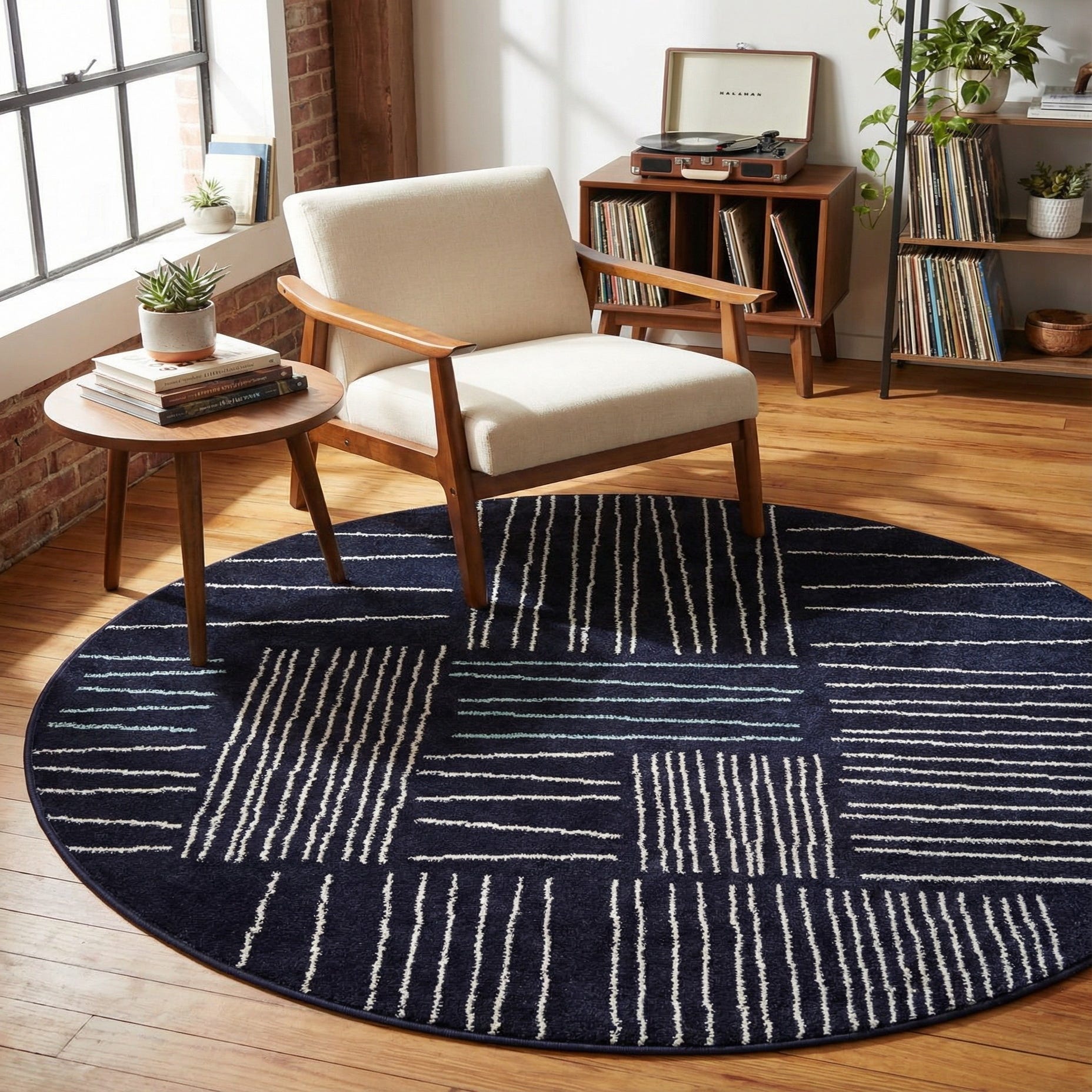 The Hanahan Collection 5-foot round rug offers a contemporary design composed of a structured geometric pattern. Expertly machine-woven from 100% polypropylene, this rug features a dominant navy blue background contrasted with ivory and light blue details. The clarity of the angular lines creates a dynamic visual that is both modern and eye-catching, while the round shape softens the geometry, making it an excellent choice for adding a touch of sophistication to any space.