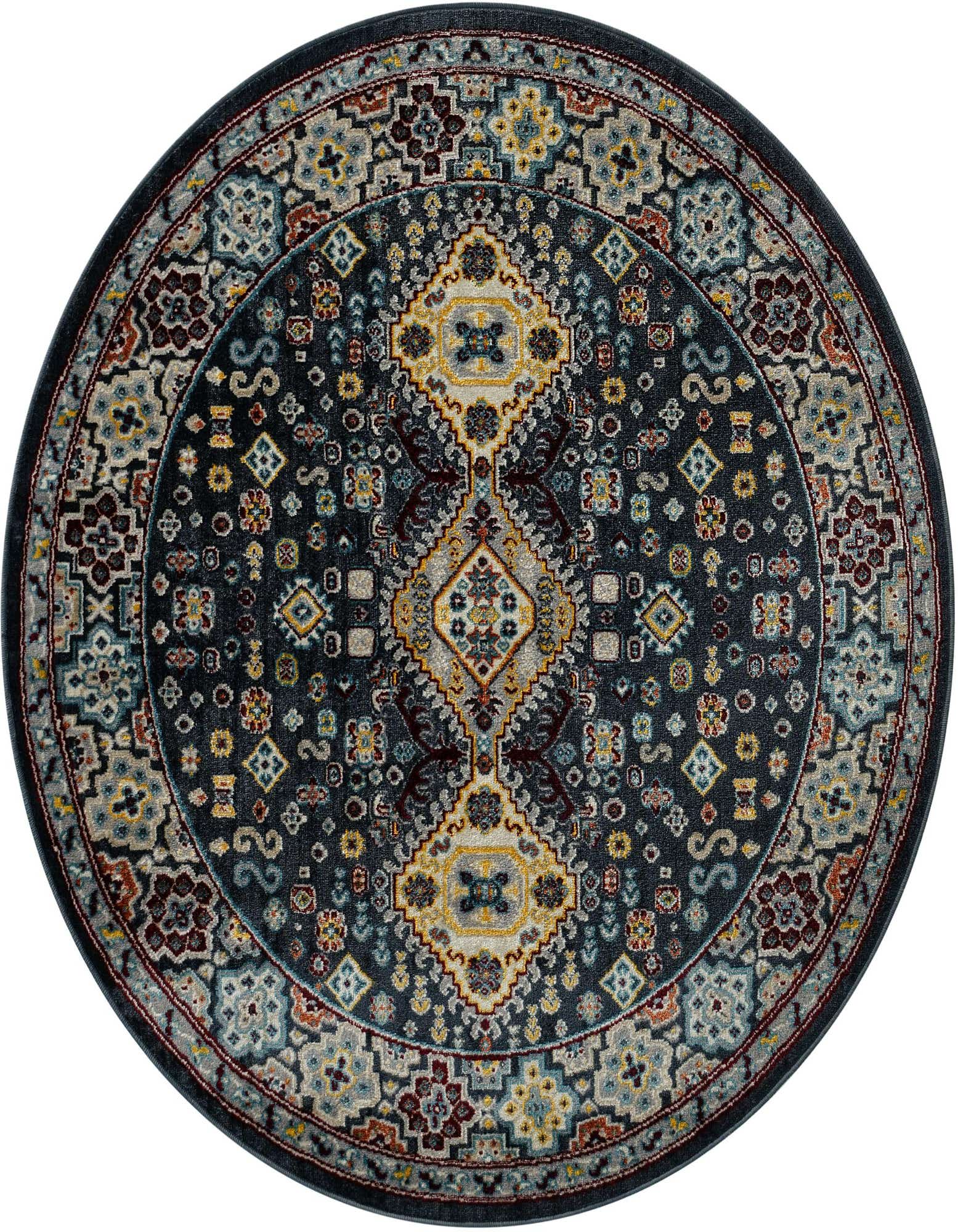 Primary color is Navy Blue. Colors in this rug include: Navy Blue, Ivory, Gray, Red, Yellow.