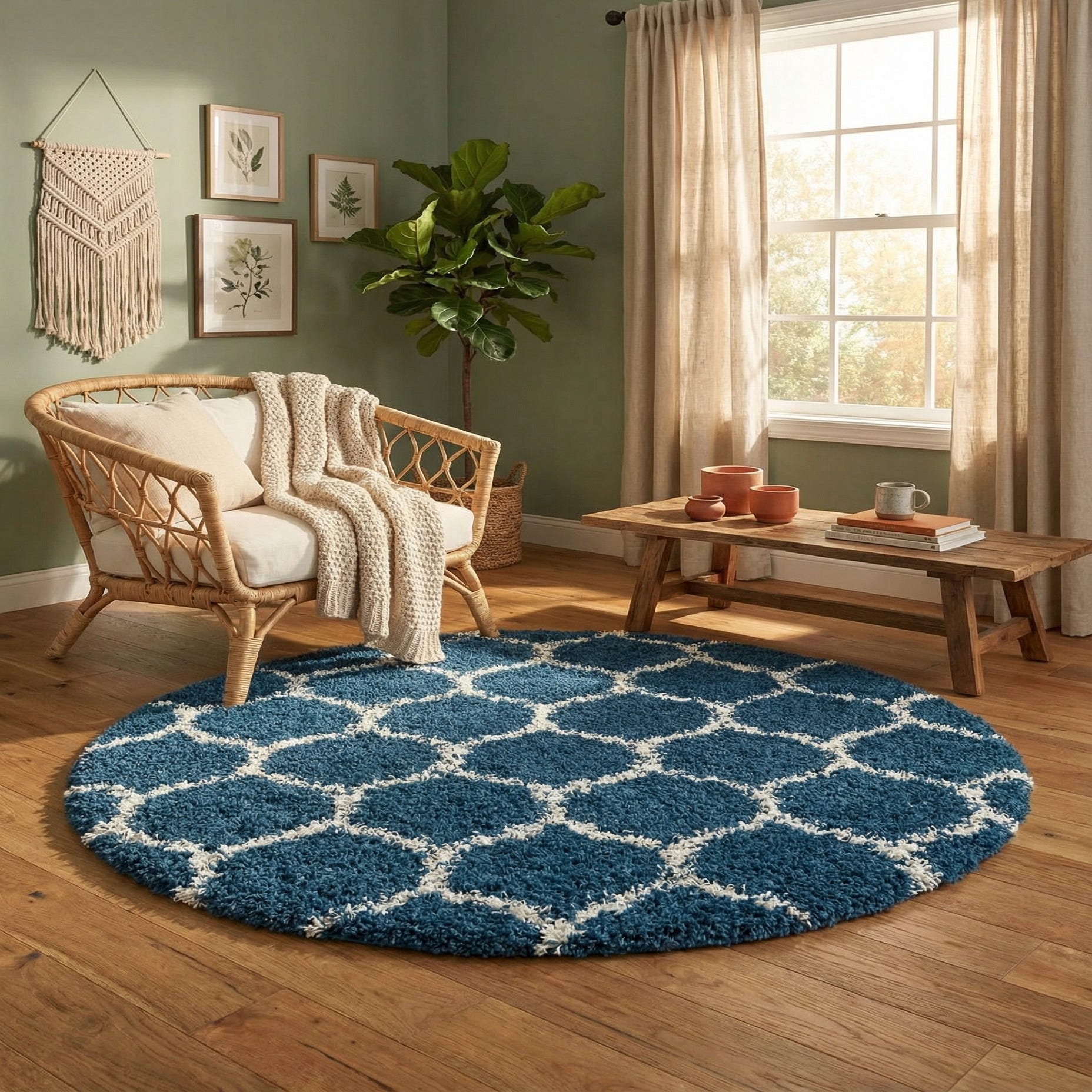 A round navy blue shag rug with a white modern lattice pattern, featuring a high/low textured pile.