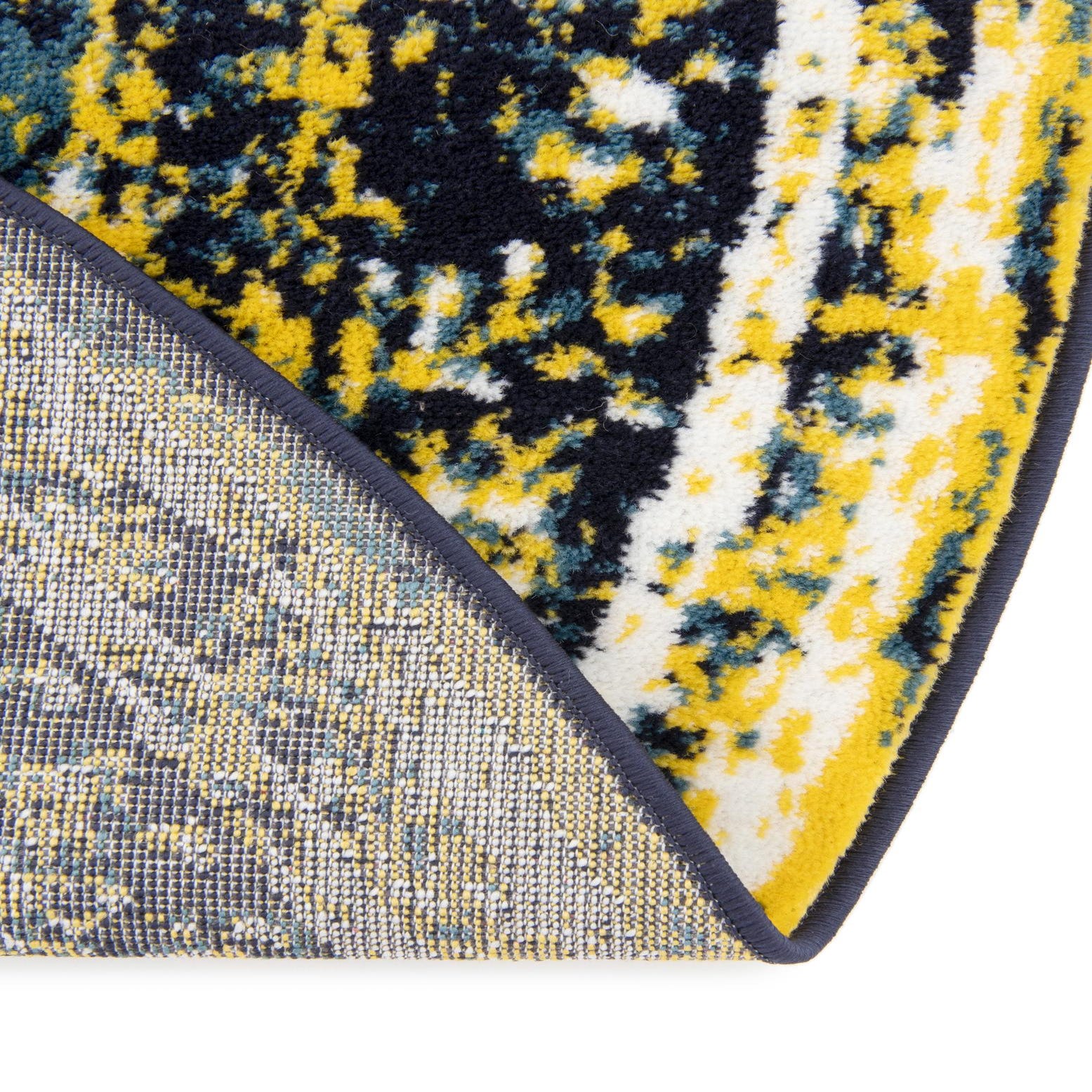 A bold, round medallion takes center stage in a distressed, painterly pattern that balances vintage character with contemporary energy. Deep navy blue forms the background, while vibrant yellow splashes create lively contrast across the face of the rug. Hints of light blue and ivory thread through the design, softening the contrast and adding dimensional highlights. The machine-made construction in 100% polypropylene produces a consistent, low-profile pile with a smooth, slightly plush hand that stays close to the floor.