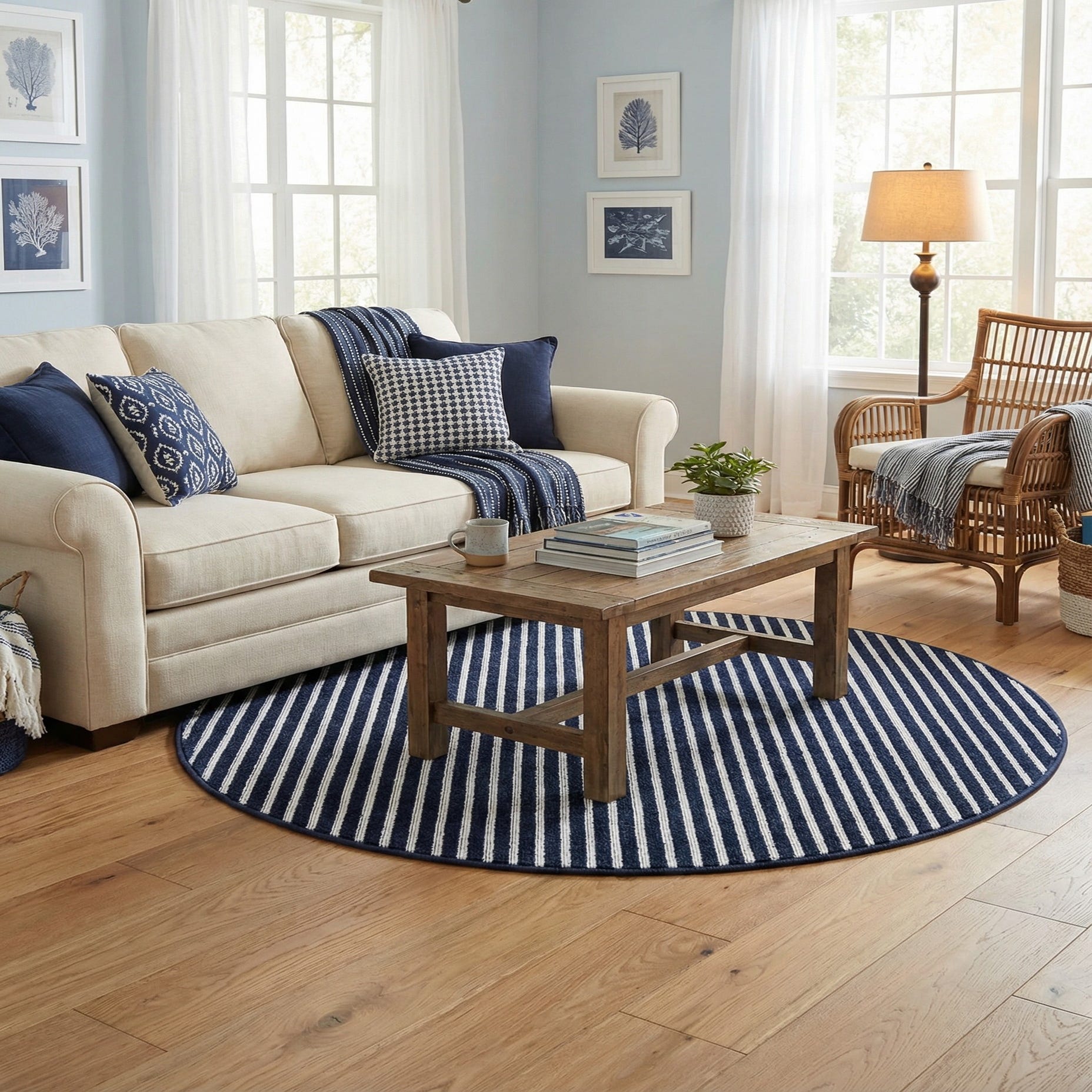 A 5' round navy blue and white striped outdoor rug, featuring a modern pattern and textured pile.