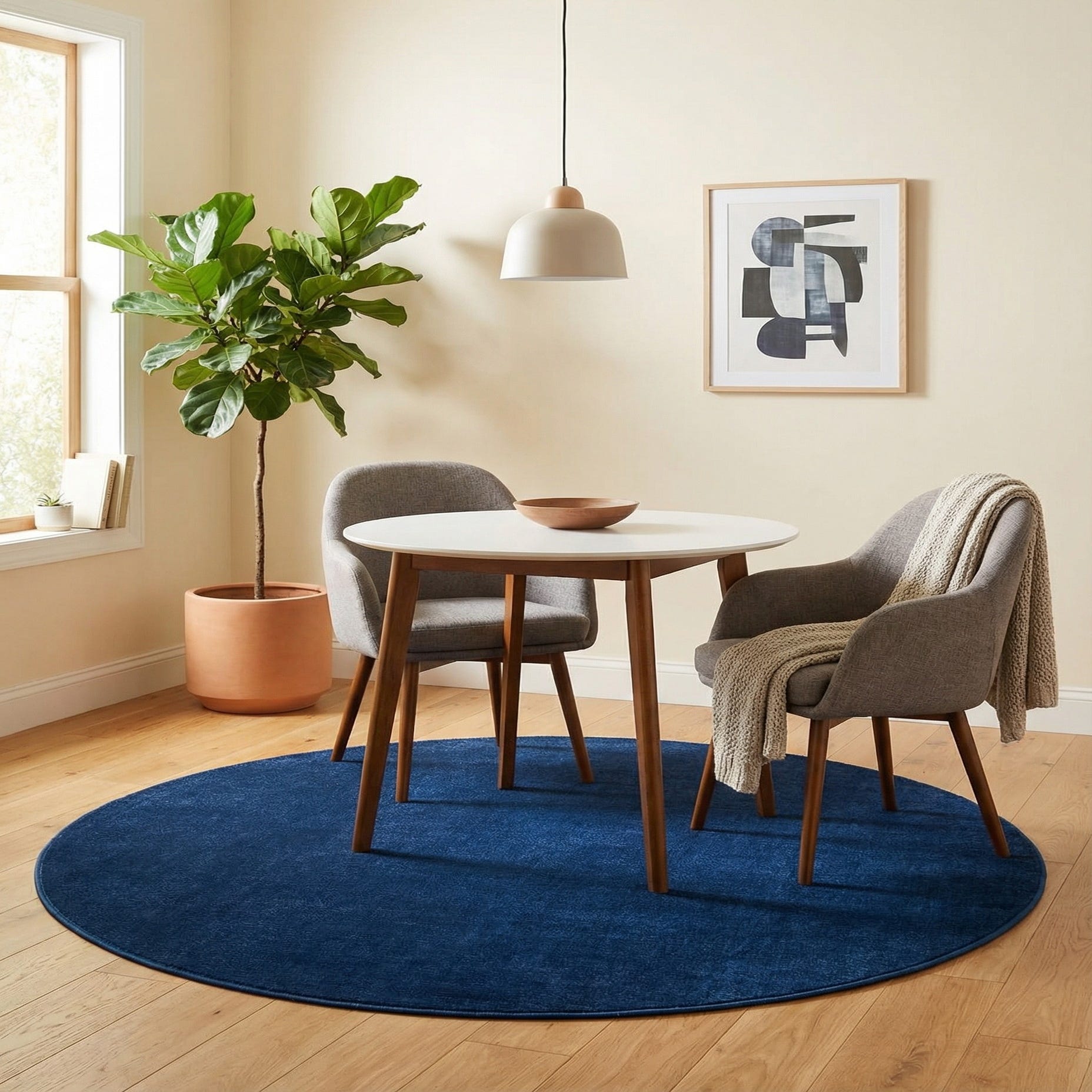 Machine-made from 100% polypropylene, the construction delivers a consistent, dense hand and a smooth finish. Works well centered beneath a round dining table, under a bedside grouping, or to anchor a seating area in a living room or home office. Pair it with warm wood tones and brass accents for mid-century modern styling, crisp white textiles for a coastal or contemporary look, or layered with natural-fiber rugs to add color without busy pattern.