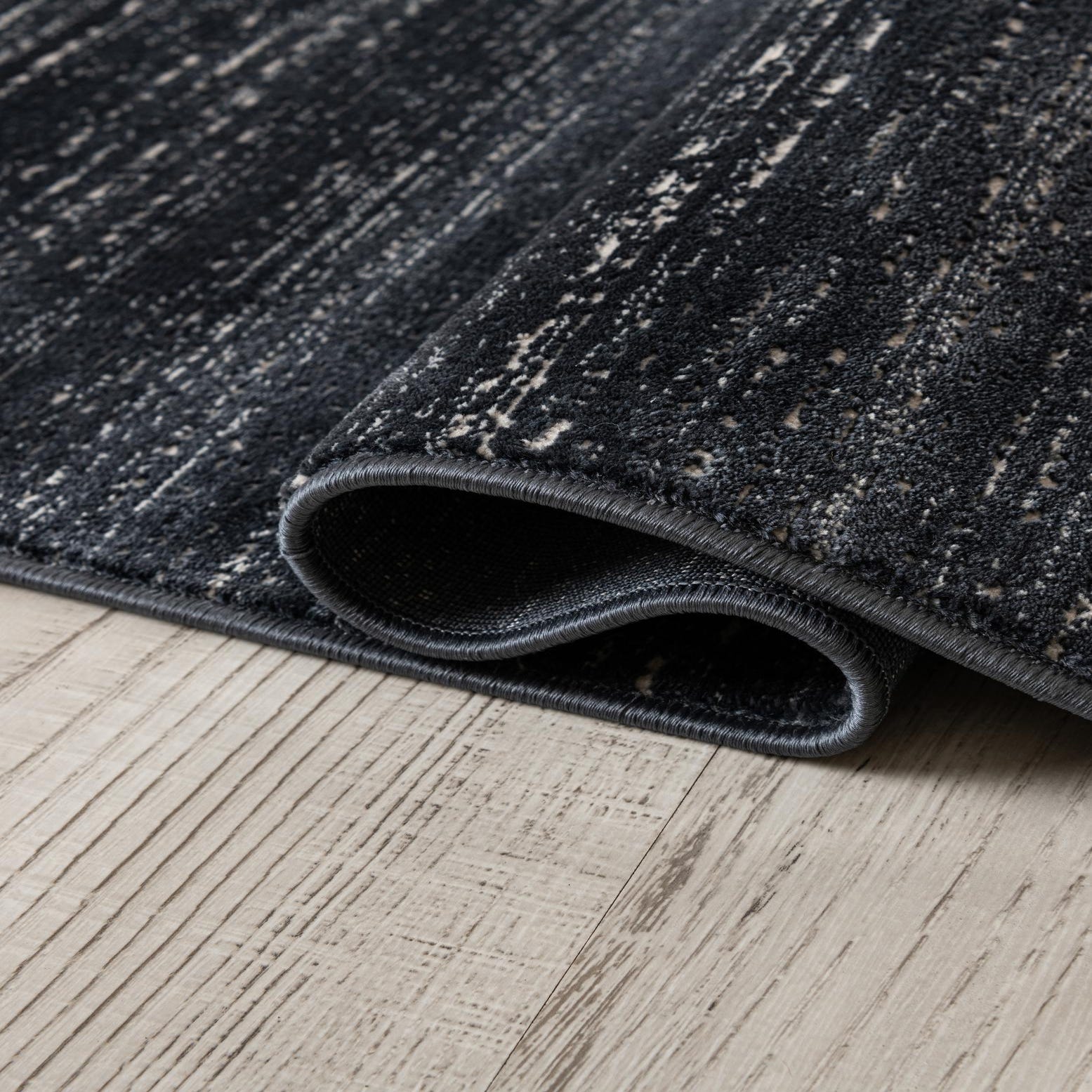 A deep navy field anchors this round rug, punctuated by fine ivory striations that run subtly across the surface for a soft, linear effect. The pattern reads like a modern, low-contrast strié—clean and contemporary without strong motifs—so it integrates easily with a range of furnishings. Machine-made from 70% polypropylene and 30% polyester, the construction delivers a close, low pile with a smooth hand and a gentle luster from the synthetic fibers.