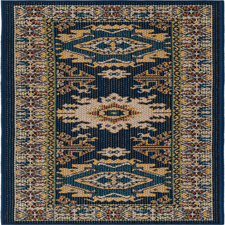 A 5 Ft runner rug from the Baja Outdoor collection, featuring a traditional Oriental pattern in shades of blue, yellow, red, and cream.