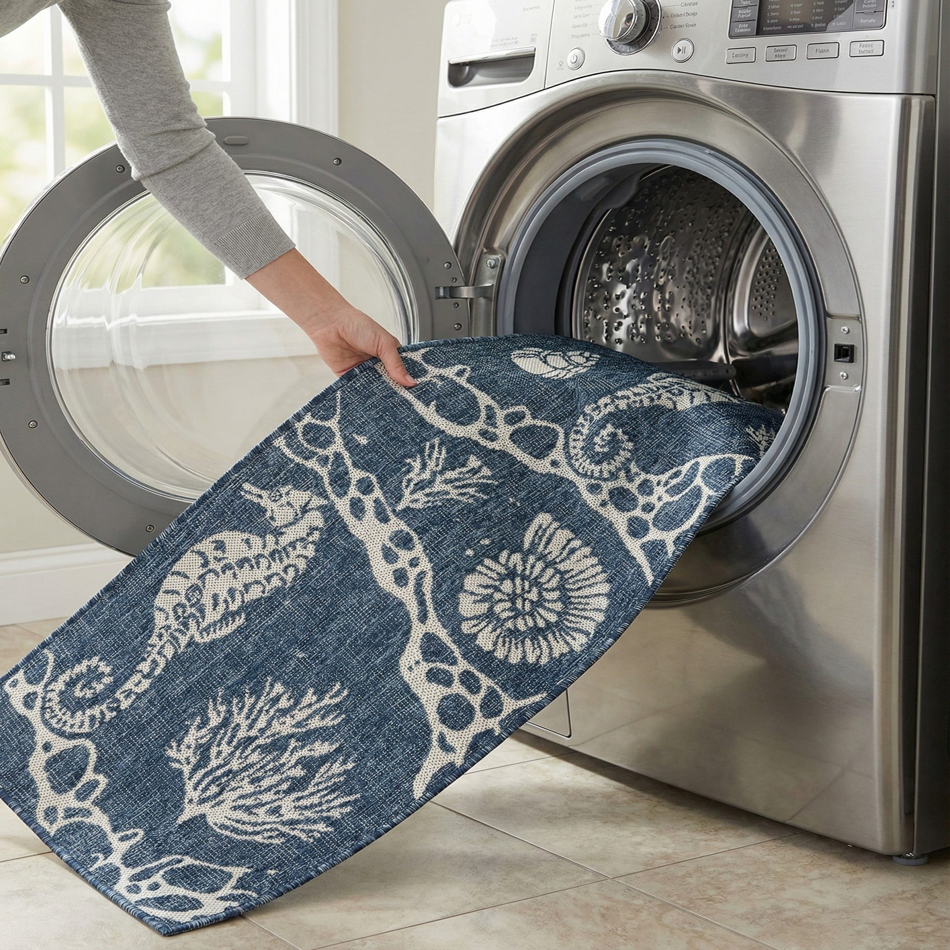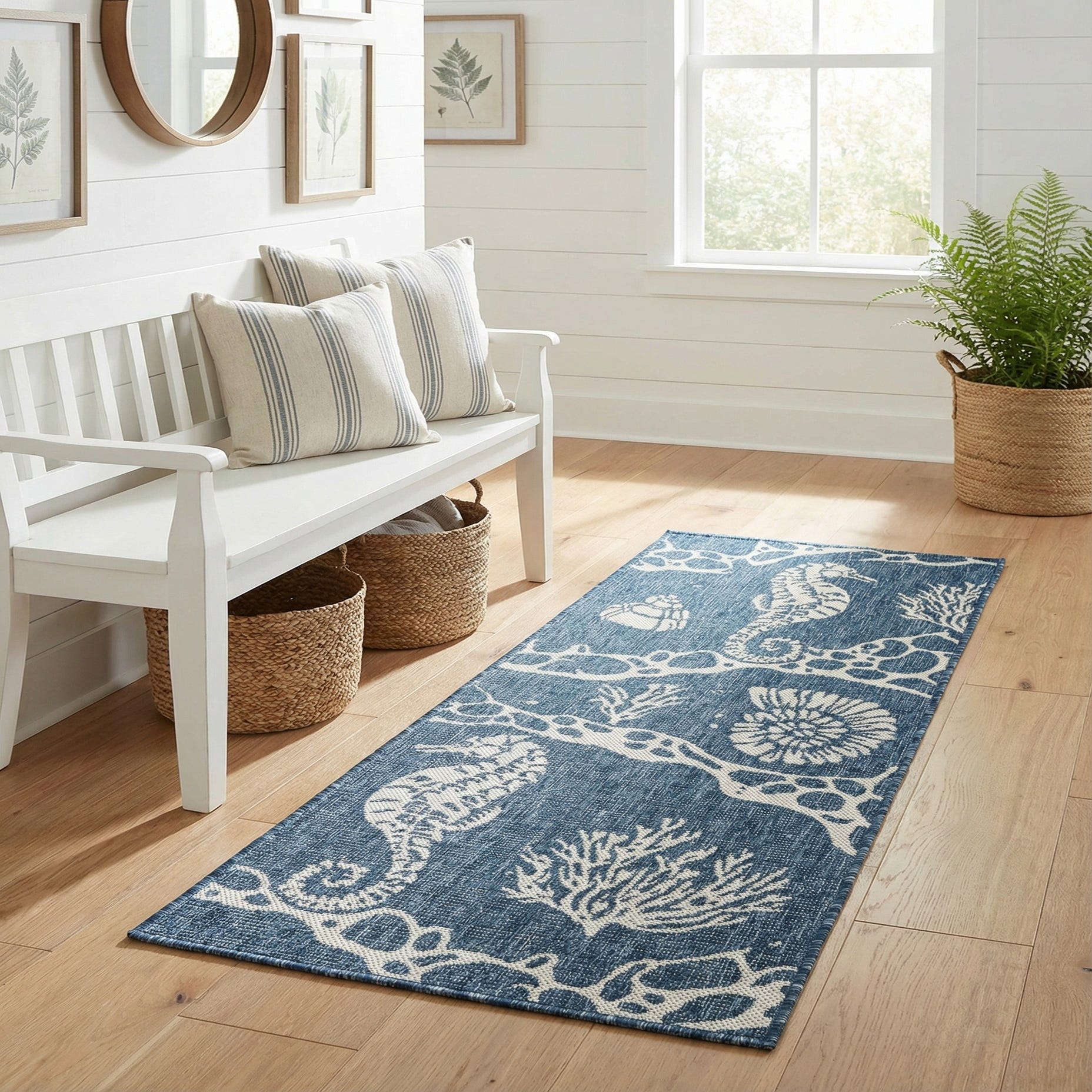 A navy blue and white coastal runner rug featuring seahorses, coral, and seashells, perfect for a hallway or patio.