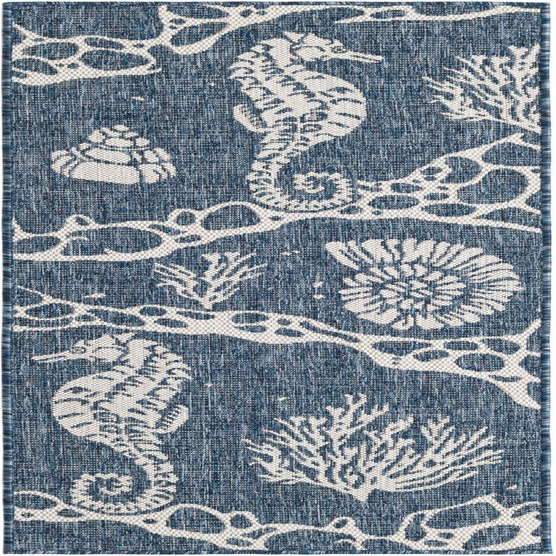 A navy blue and white coastal runner rug featuring seahorses, coral, and seashells, perfect for a hallway or patio.