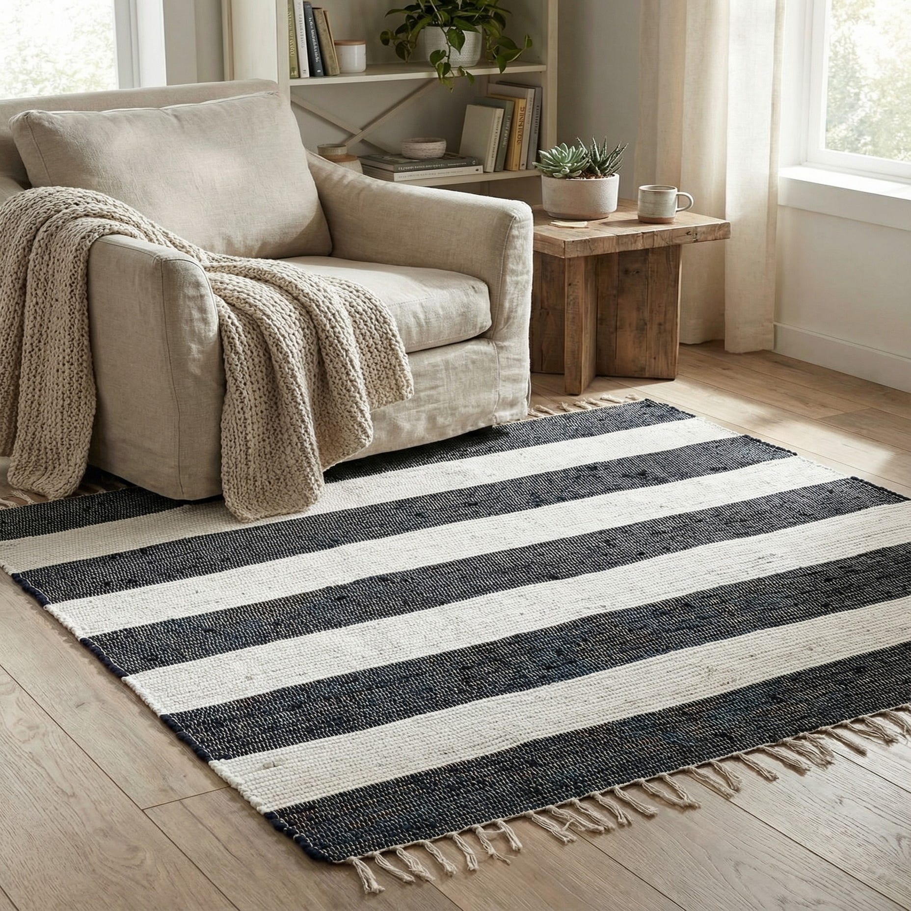 This striped rug works well in casual and contemporary settings alike: place it in an entry or kitchen to add definition without bulk, layer it in front of a sofa for a lived-in living room, or use it under a bedside seating area to introduce pattern and contrast. It pairs naturally with light woods, white or neutral walls, and materials like linen and rattan for coastal or Scandinavian-inspired interiors, and it can also provide a clean, graphic counterpoint in modern farmhouse or industrial schemes.