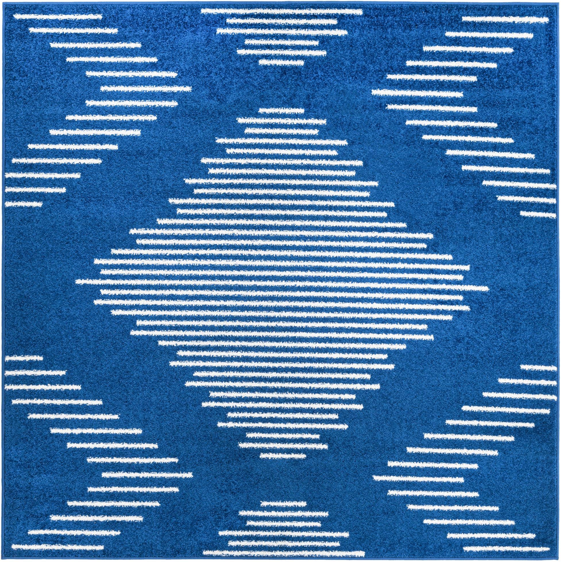 A 5' 3 x 5' 3 square Kai rug in deep blue with a modern white striped diamond pattern, suitable for indoor spaces.