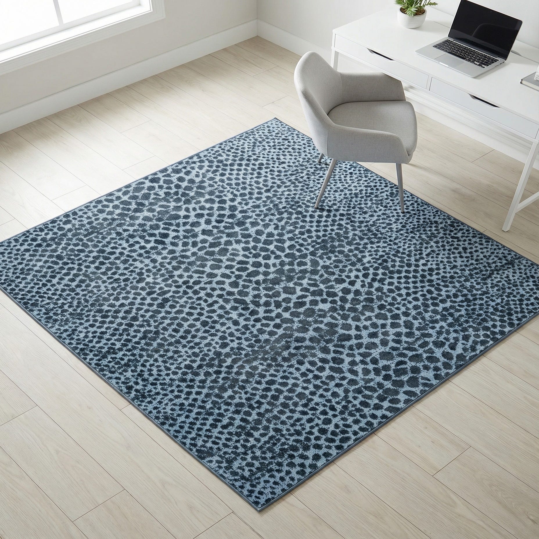 The navy blue foundation provides a calming and sophisticated anchor for the spirited design, making it suitable for a variety of decor styles, from contemporary to transitional living rooms, bedrooms, and home offices. Its stain-resistant and pet-friendly properties ensure it can withstand the demands of daily life, while the machine washable and shed-free qualities make it practical for high-traffic areas and easy to maintain.