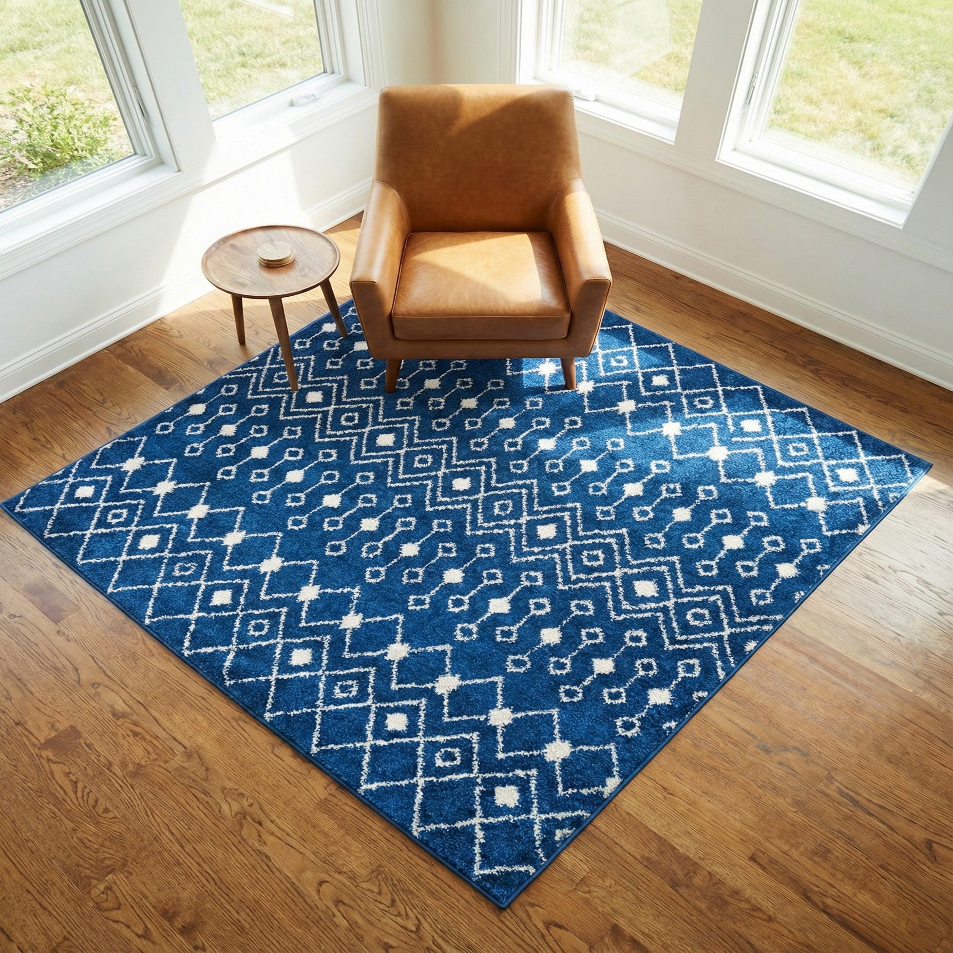This rug works well as an anchor for a small seating group, a reading nook, or an entryway—its scale and pattern bring visual interest without overwhelming a compact space. Pair it with light-washed woods and white trim for a coastal or nautical palette, add warm brass or leather accents for a modern-traditional mix, or layer it with neutral textiles in a casual, contemporary living room.