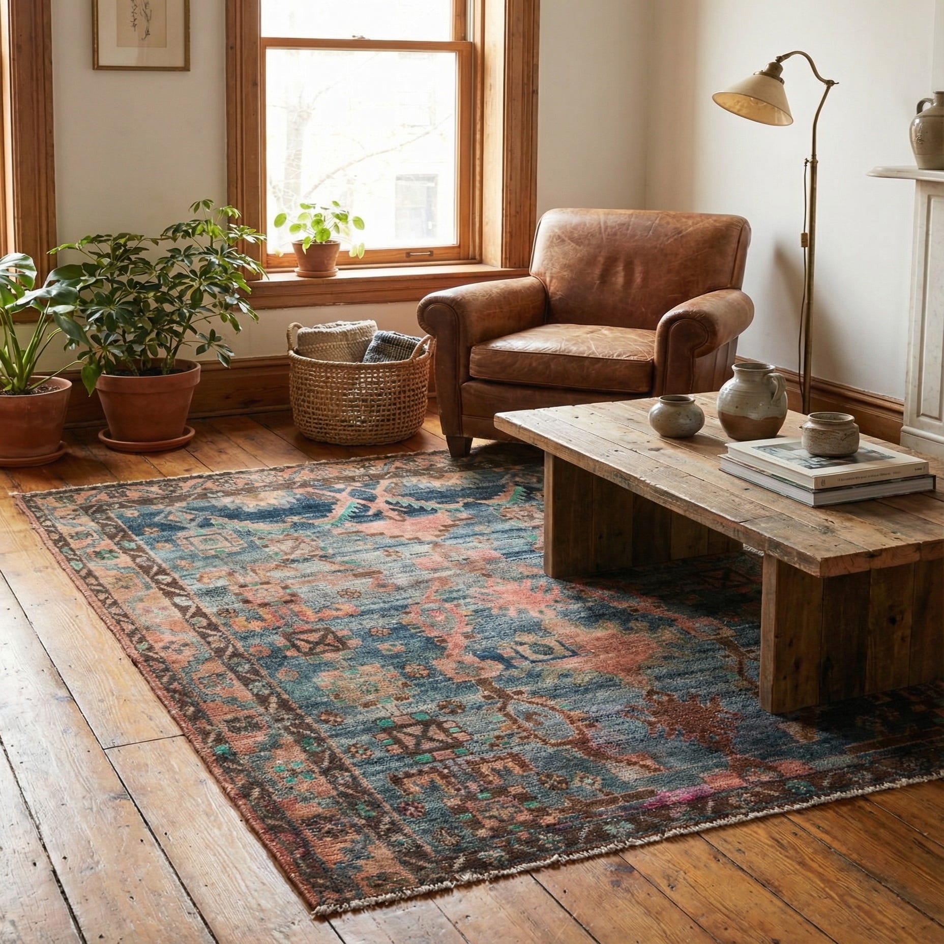 A square 4' 5 x 5' 3 Ultra Vintage rug featuring a distressed Persian pattern in shades of blue, brown, and muted pink.