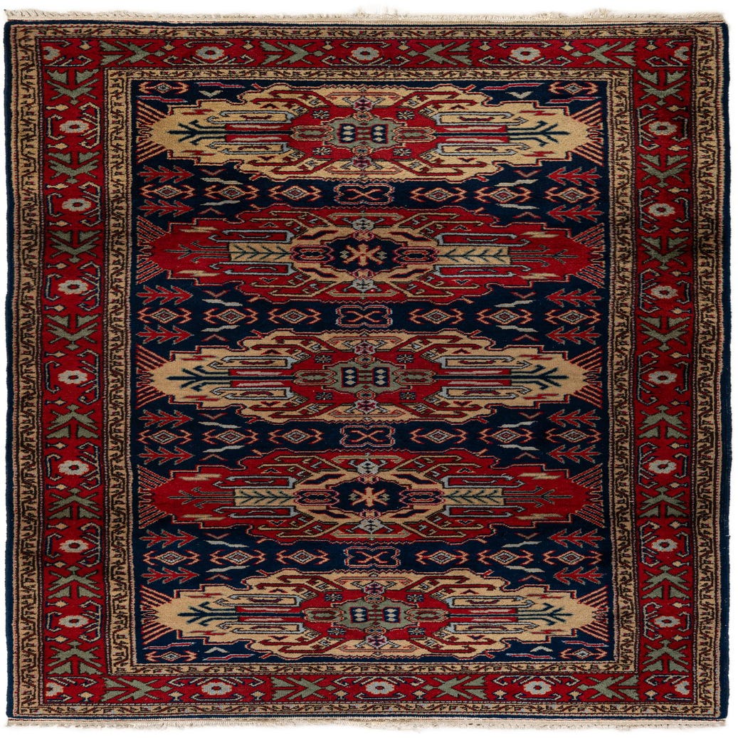 A 5x7 rectangular Rugs.com Kazak rug with a traditional Oriental pattern in navy blue, red, and beige.