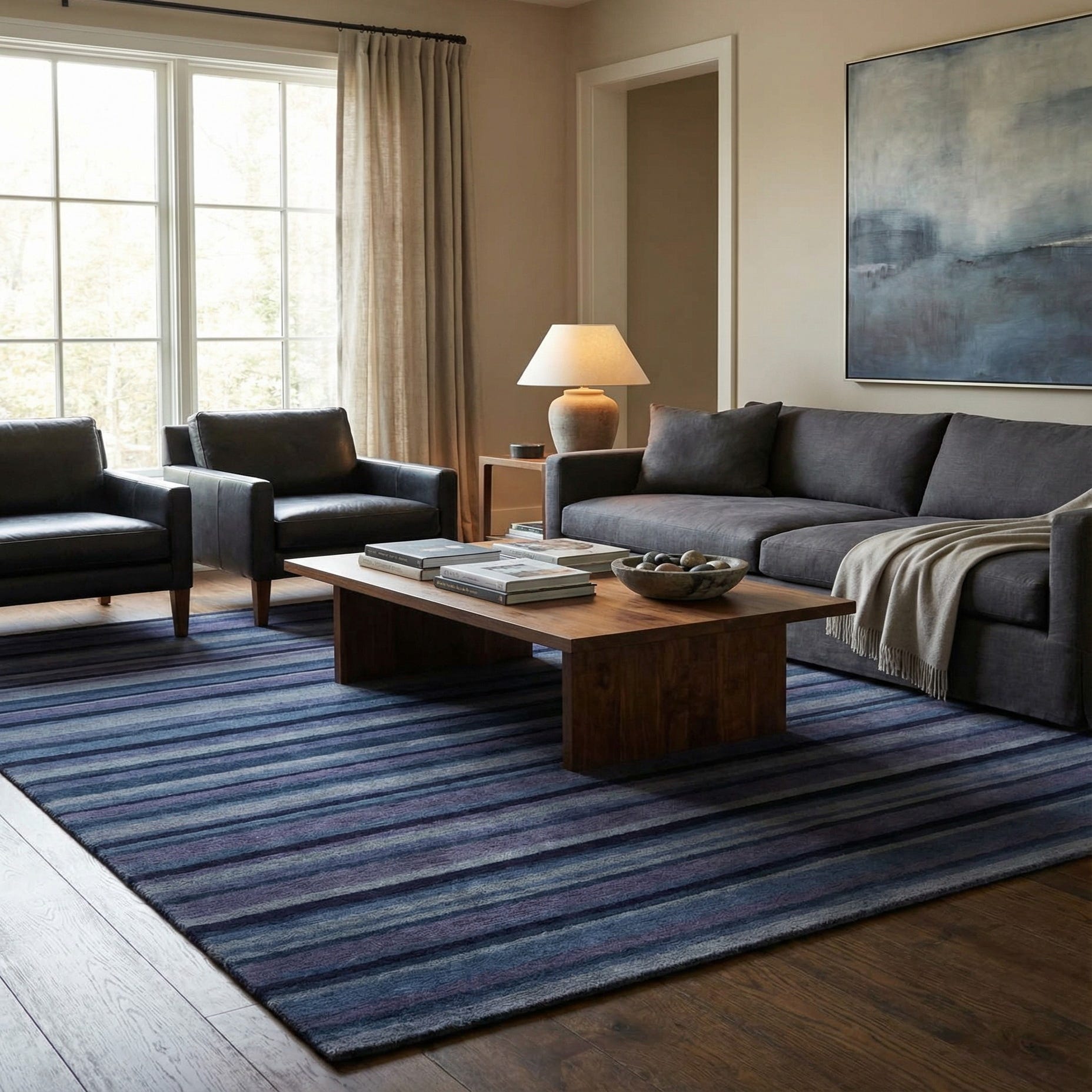 The rug's pattern offers versatility, allowing it to serve as a grounding element in a variety of interior design settings. Its subdued yet varied color spectrum makes it suitable for contemporary settings seeking a touch of elegance without overwhelming a space. Additionally, its linear design can complement minimalist aesthetics or act as a unifying element in eclectic decor. The rug could effortlessly integrate into a professional office environment, a modern living room, or a calm bedroom retreat, where its coloration adds depth and its texture contributes to a layered design approach.