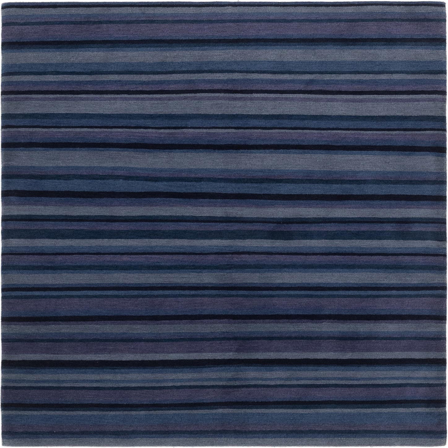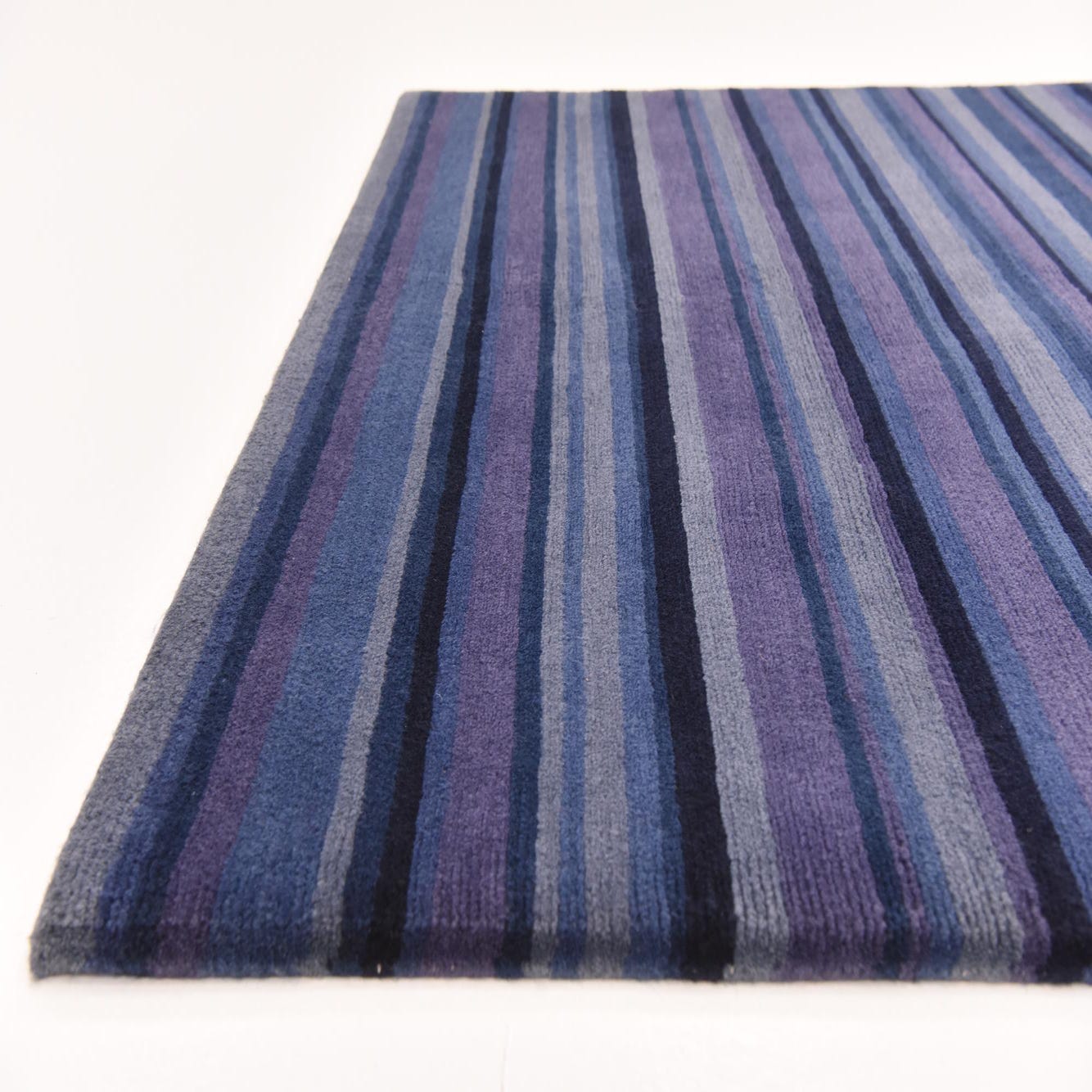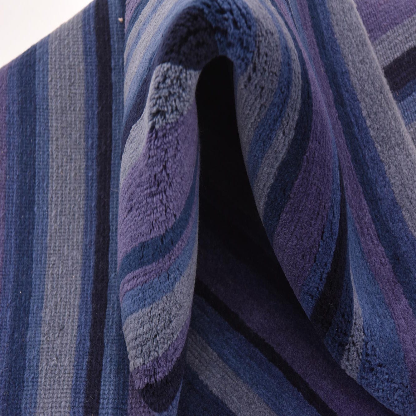 The Nepal Collection offers a 5x7 hand-knotted rug constructed of 100% wool, presenting durability and a soft texture underfoot. This particular rug features a harmonious blend of horizontal stripes in a sophisticated palette of navy blue, blue, light blue, purple, and black, establishing a dynamic visual rhythm across its surface. The predominant navy blue background provides a deep, rich canvas for the pattern's colors to interact.