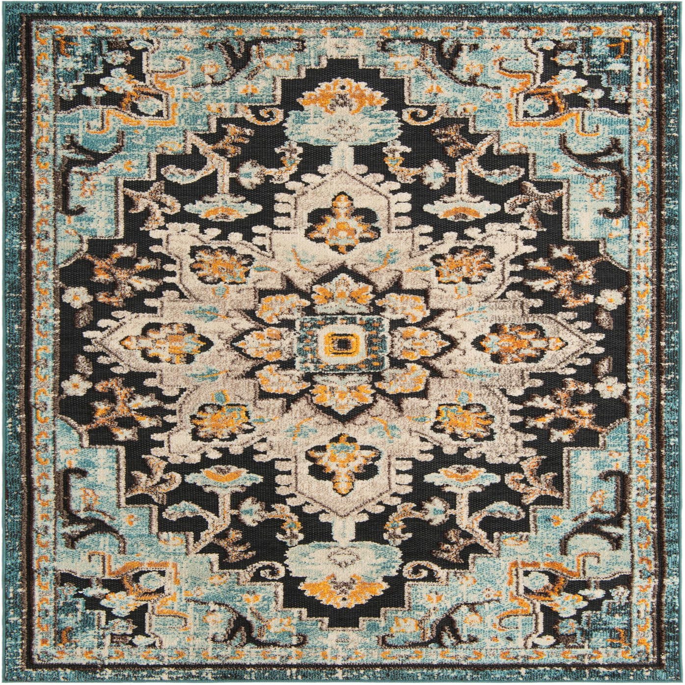 Primary color is Navy Blue. Colors in this rug include: Navy Blue, Beige, Blue, Brown, Ivory, Light Blue, Yellow, Teal, Orange.