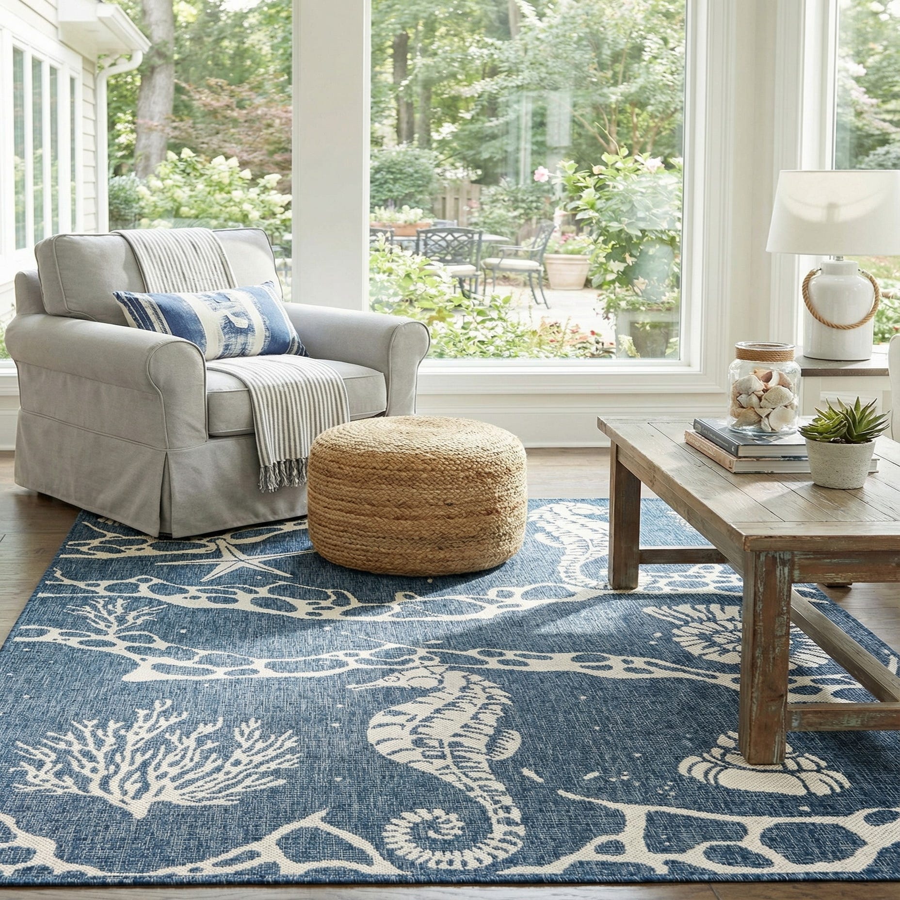 With its coastal-inspired design and robust construction, this rug is well-suited for a variety of settings, including but not limited to patios, decks, poolside areas, and sunrooms. Its clean lines and crisp color palette would complement contemporary, coastal, or nautical-themed décor, creating an inviting and cohesive outdoor living environment.