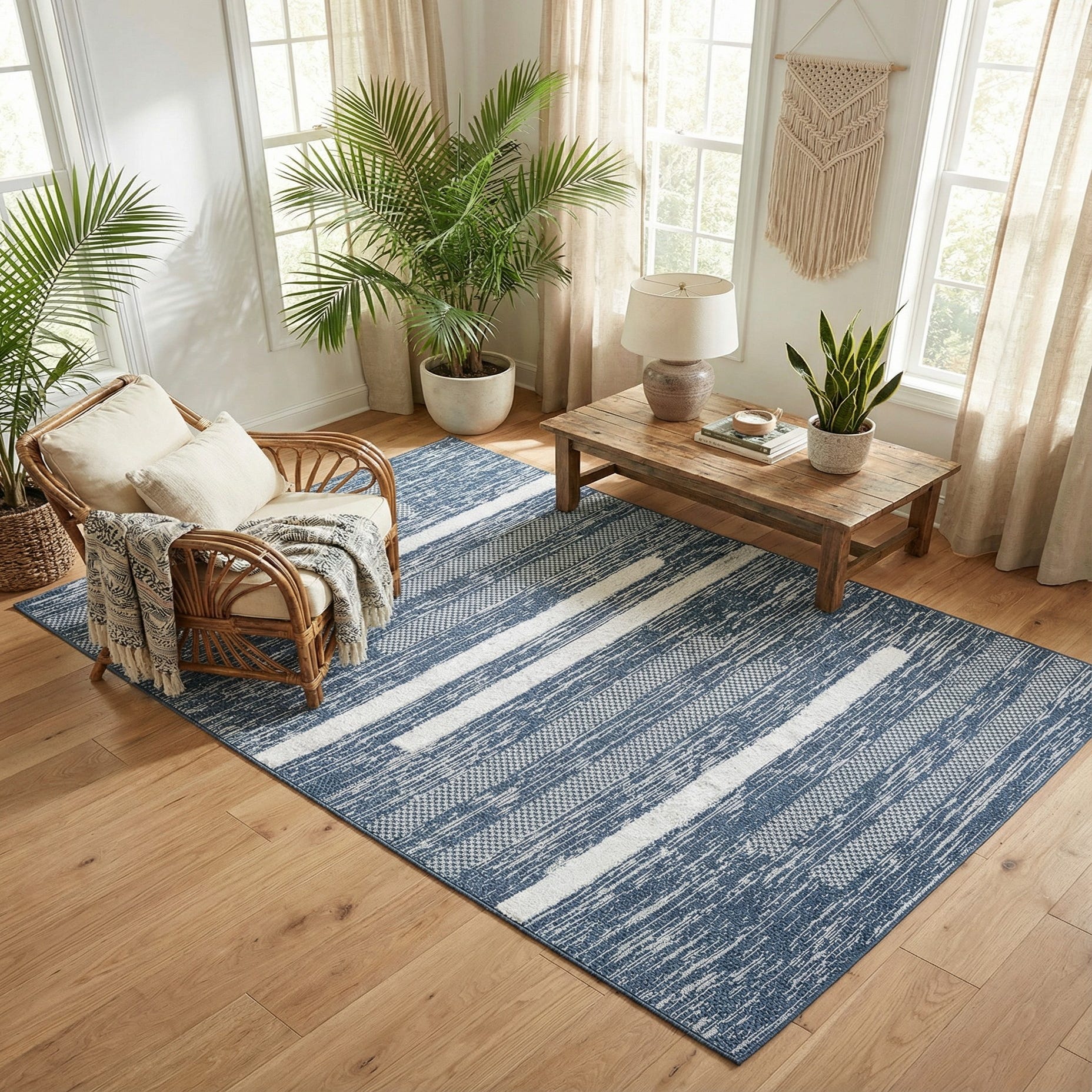 Crafted with a flatweave construction, the rug has a distinct texture that adds a tangible dimension to its appearance. As a shed-free product, it ensures a clean and low-maintenance addition to any room. The interplay of dark and light hues in this rug makes it an adaptable choice for various decor settings, from contemporary to coastal-inspired interiors.
