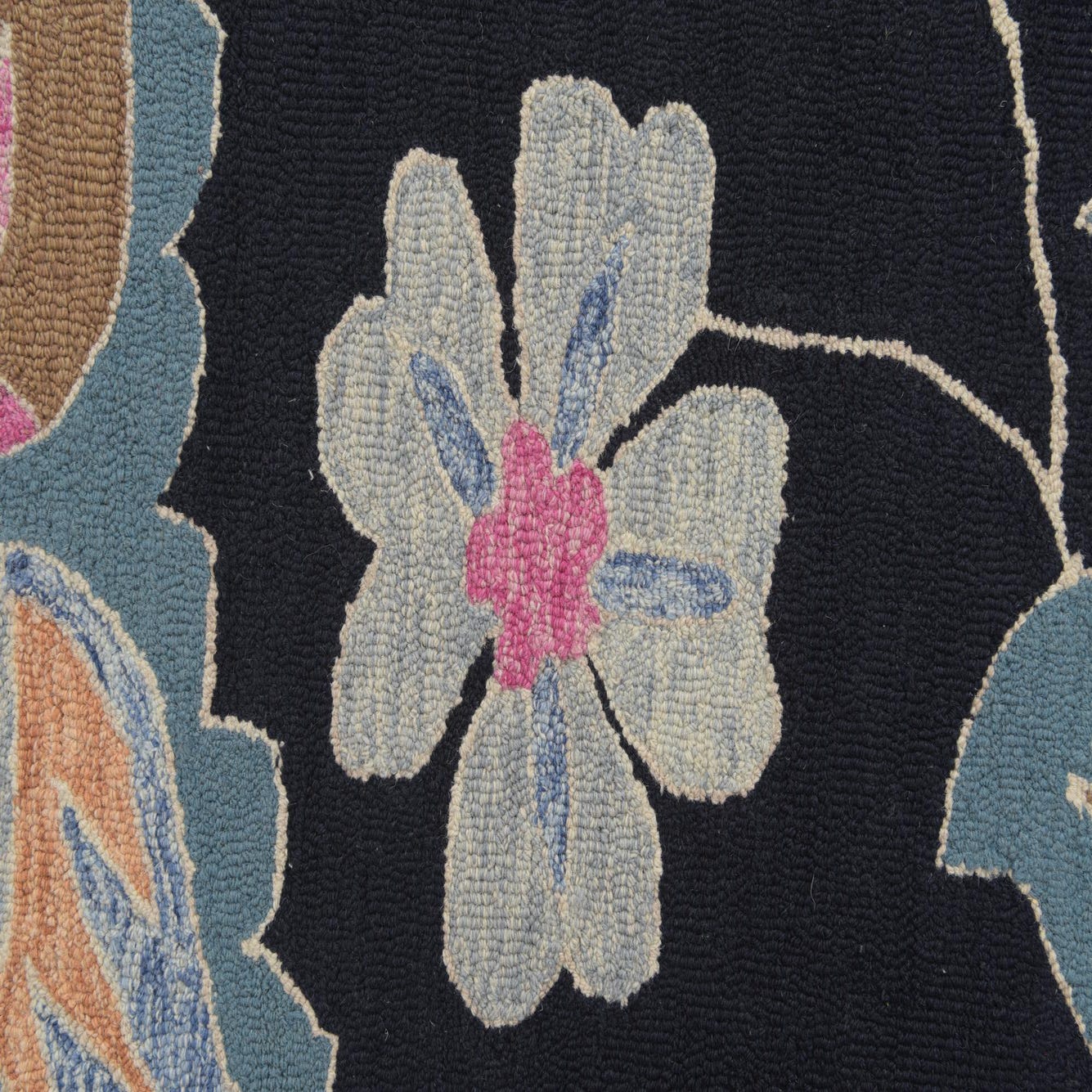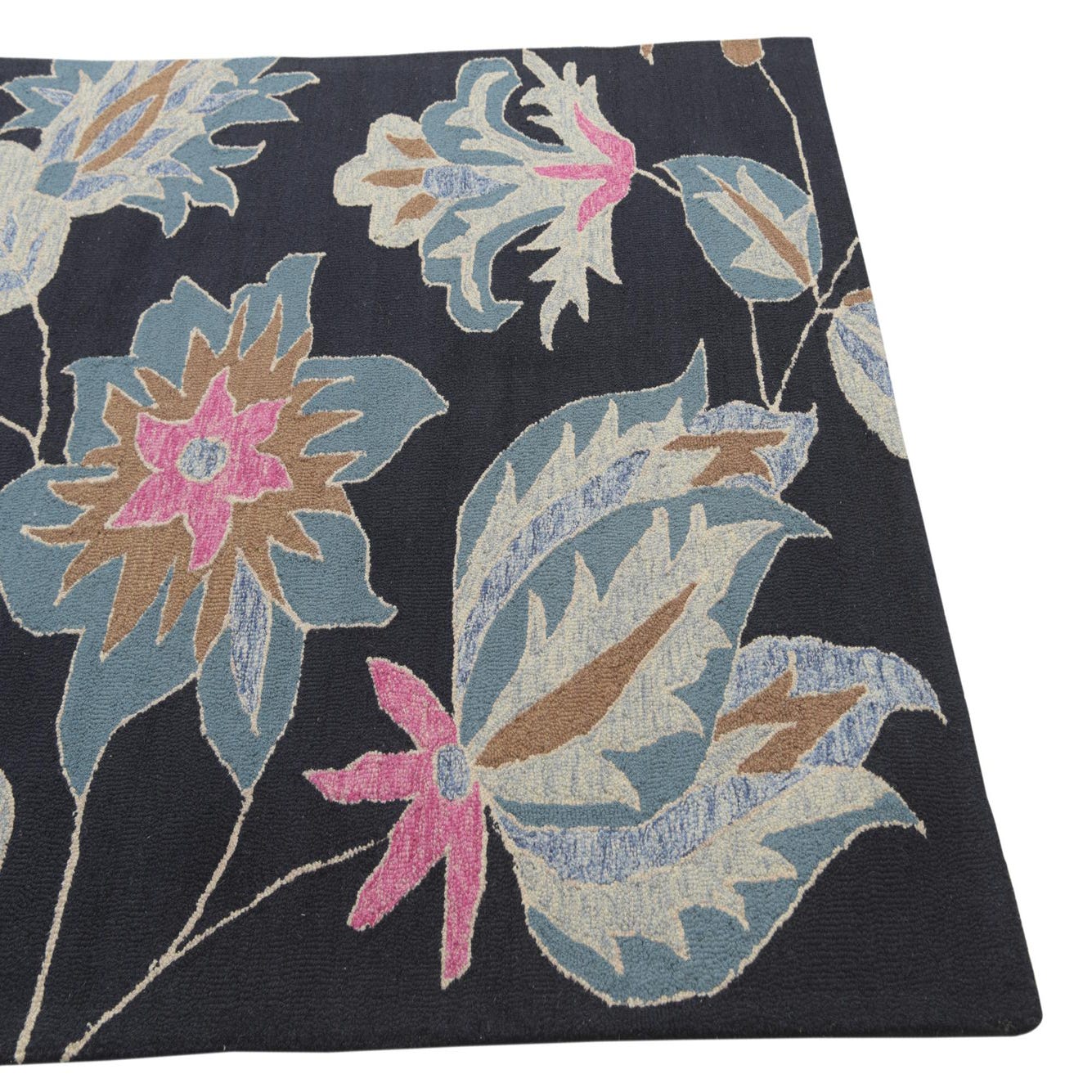 A 5x8 rectangular navy blue wool rug with a vibrant floral and botanical pattern in blues, pinks, and browns.