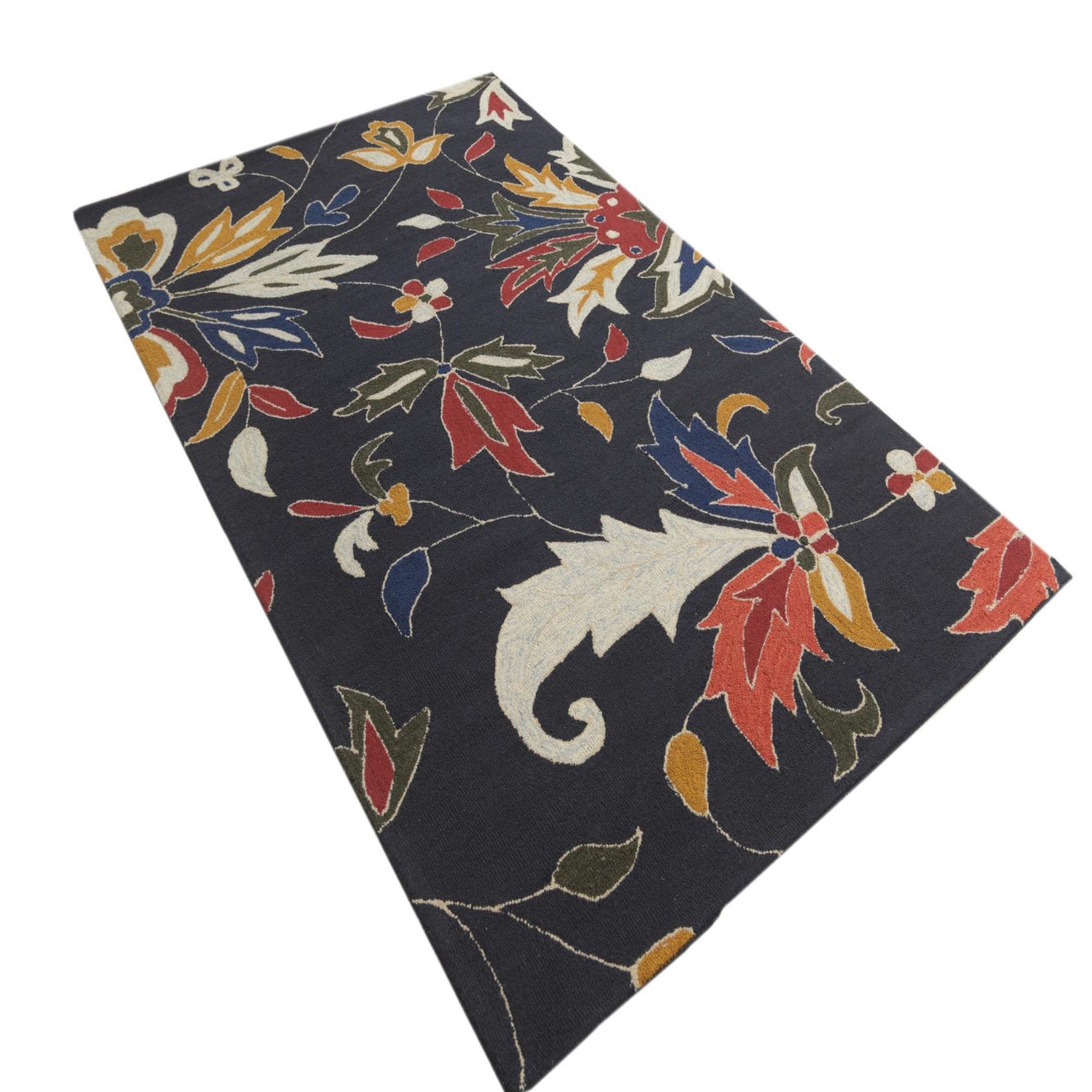 A 5x8 rectangular navy blue wool rug with a vibrant floral and botanical pattern in red, gold, white, and blue.