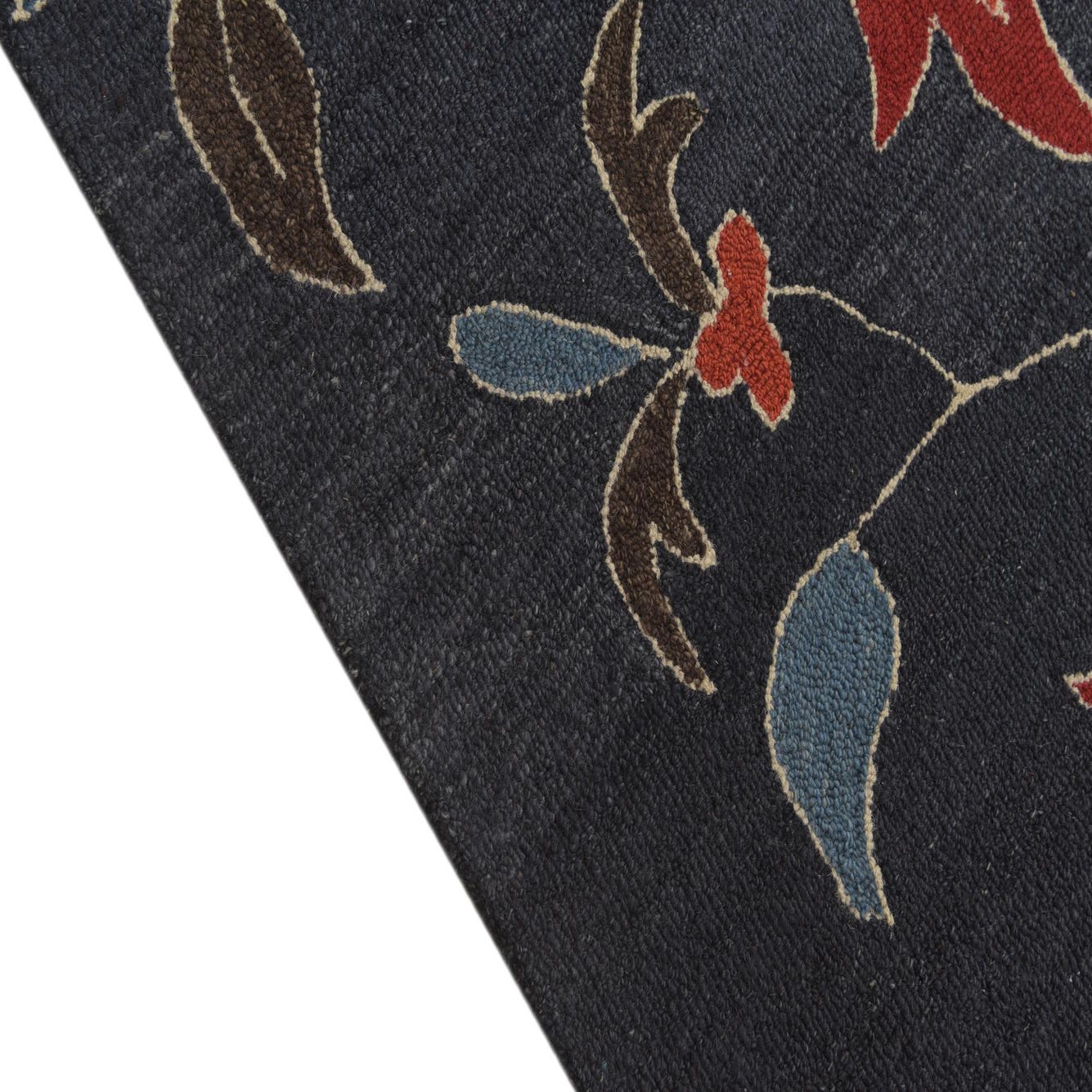 The Agra Collection 5x8 rug is a hand-tufted piece crafted from 100% wool, offering a durable and plush feel underfoot. Its robust navy blue background sets a dramatic stage for the vibrant pattern which includes hues of brown, ivory, red, orange, and blue. This rug features an organic and fluid botanical motif, a contemporary interpretation of classic floral designs, lending a sense of movement and artistic flair to the piece.