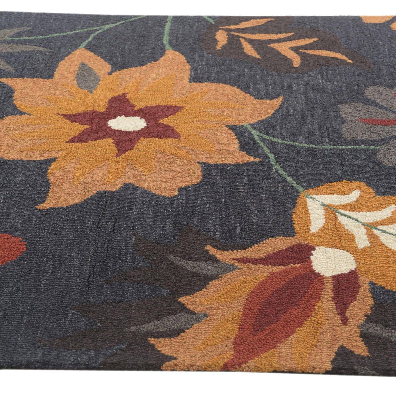A 5x8 rectangular navy blue wool rug featuring a vibrant modern floral pattern with large gold, red, and grey flowers and leaves.