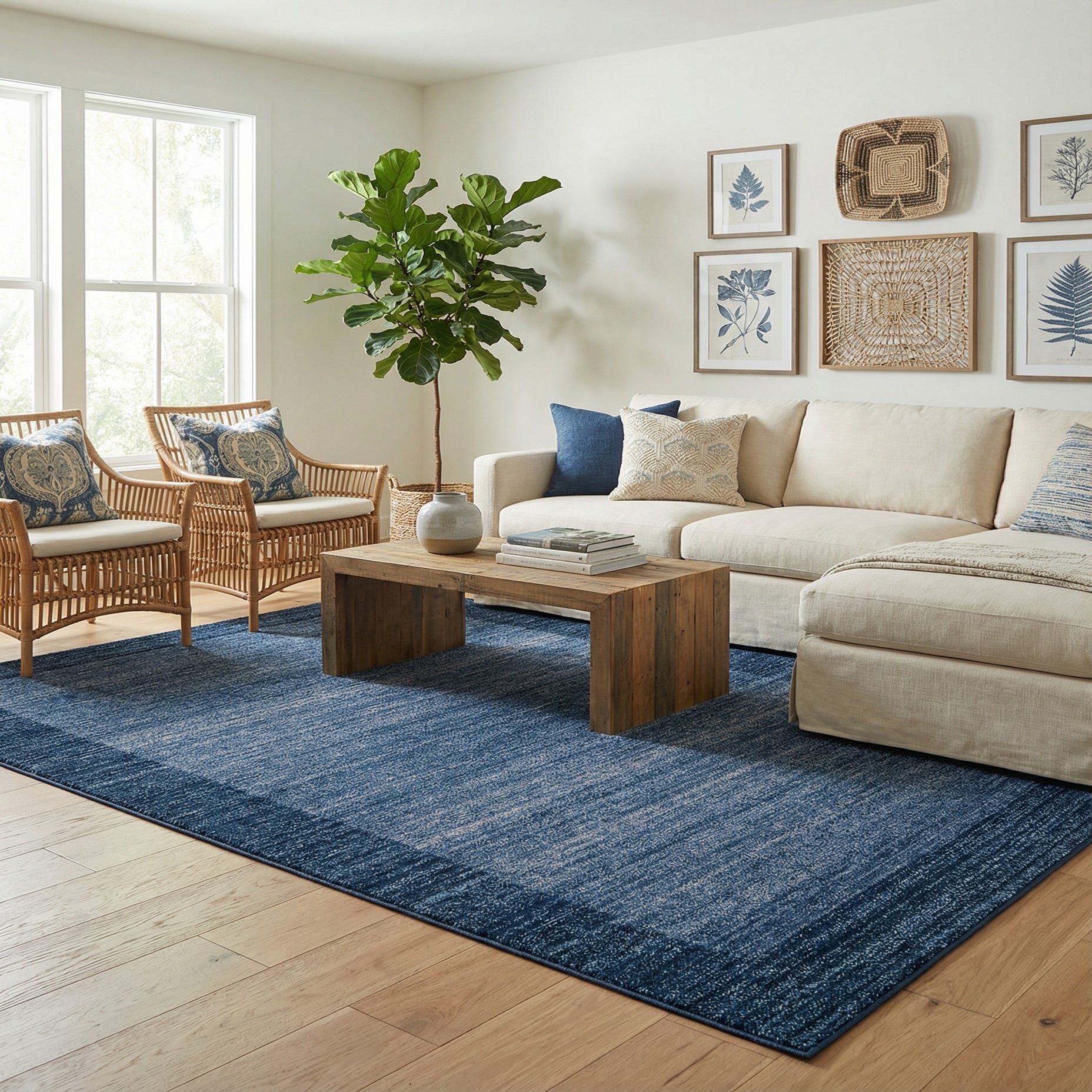 This clean, modern look fits well in contemporary and transitional interiors. Place it under a sectional to define a living area, layer it beneath a bed to add color without overwhelming the room, or use it in a home office to ground wood or metal furniture. It pairs nicely with neutral linens, warm oak floors, and brass or matte black accents for a pulled-together, calm aesthetic.