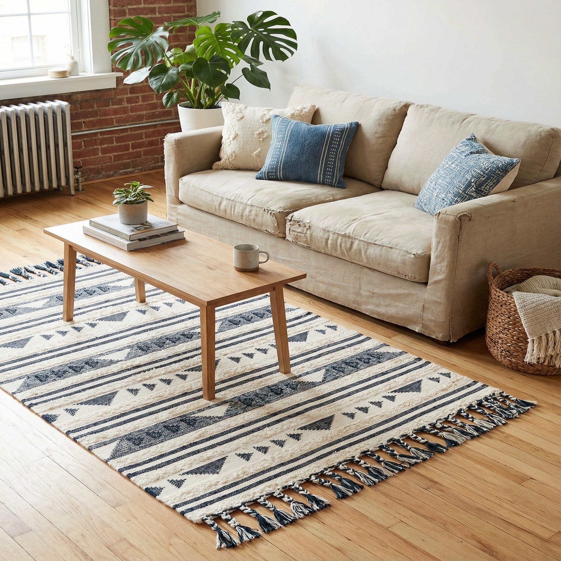 The construction pairs low, soft wool pile with flatter woven bands, giving the surface a gentle, tactile contrast—comfortable underfoot while maintaining clear pattern definition. Its navy-and-cream palette works well with light wood tones and neutral upholstery, and it complements design directions from modern farmhouse to coastal or relaxed bohemian. Place it beneath a living room seating group, layered over hardwood, or at the foot of a bed to anchor the space with both pattern and texture.