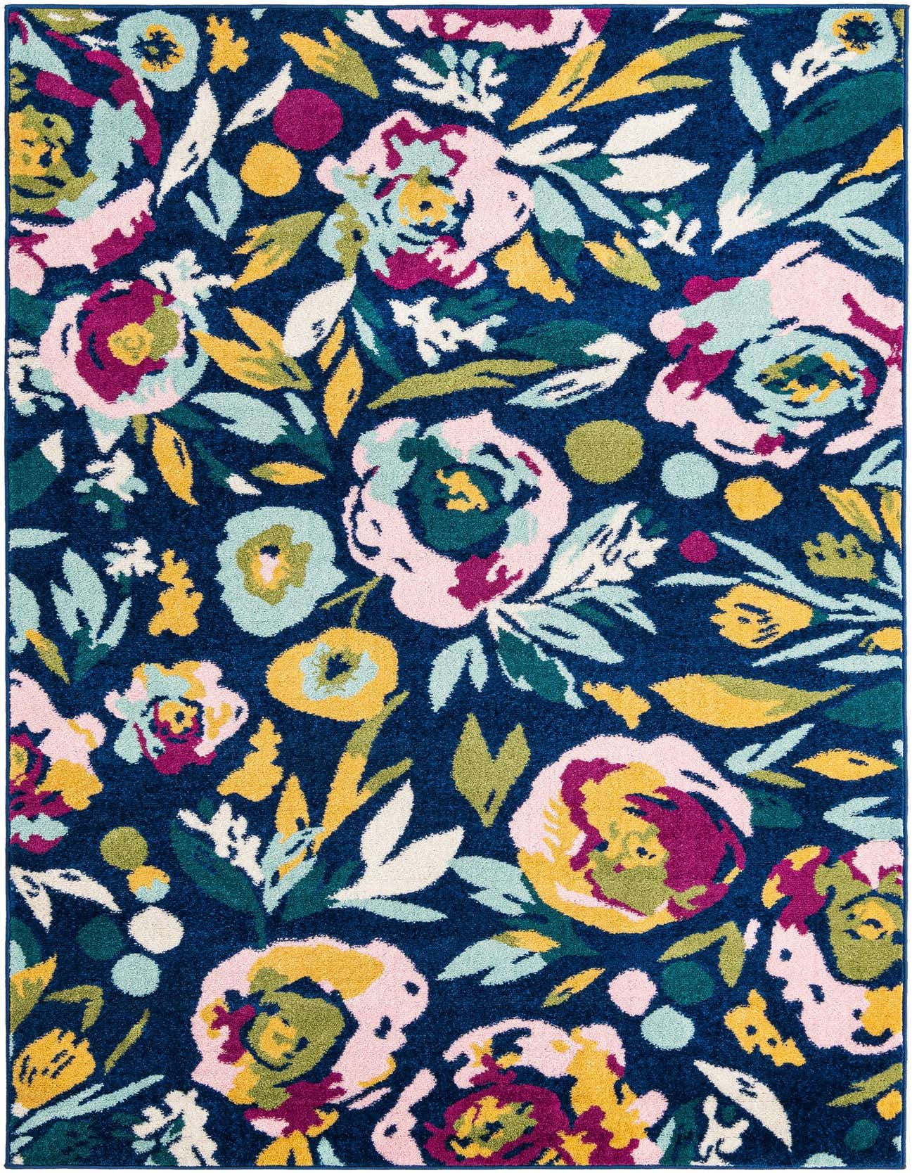 Primary color is Navy Blue. Colors in this rug include: Navy Blue, Green, Ivory, Light Blue, Purple, Yellow, Teal, Pink.