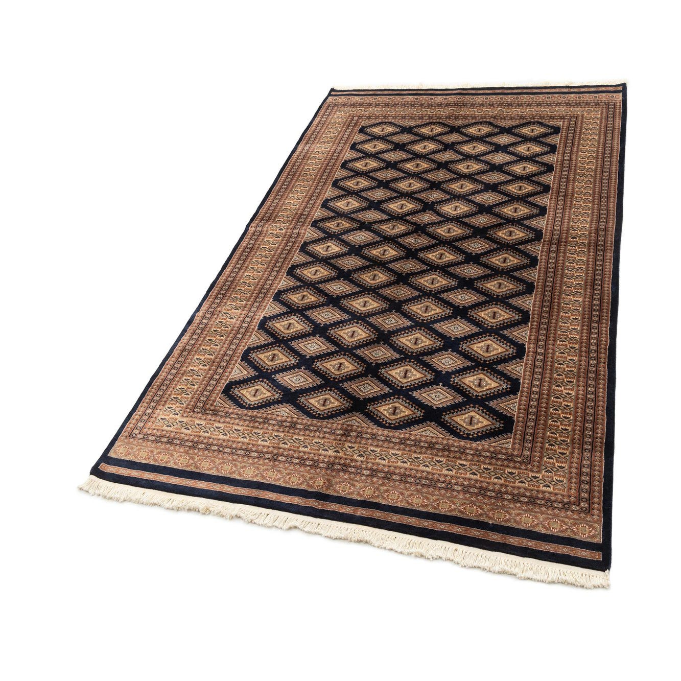 A rectangular 5x8 Bokhara wool rug featuring a navy blue field with a repeating diamond tribal pattern and a detailed beige border.